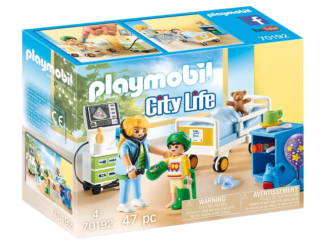 Chiar si cei mai mici pacienti se vor recupera imediat atata timp cat stau in Camera copiilor din spital de la PLAYMOBIL. Un mic ursulet somnoros ii asteapta sa se puna in pat dupa ce termina cu examinarea. Hainutele, ghiozdanelul si articolele de curatere le poate tine in noptiera albastra de langa patut. Doctorul verifica starea manutei si a piciorusului. Se pare ca in curand o sa-si poata da jos ghipsul si va fi ca nou. Dar pana atunci, cat timp mai sta in spital cel mic, poate sa picteze si sa-si atarne pe pereti micile opere de arta. Cand o sa plece din spital o sa le ia cu el, astfel incat sa se bucure si acasa.