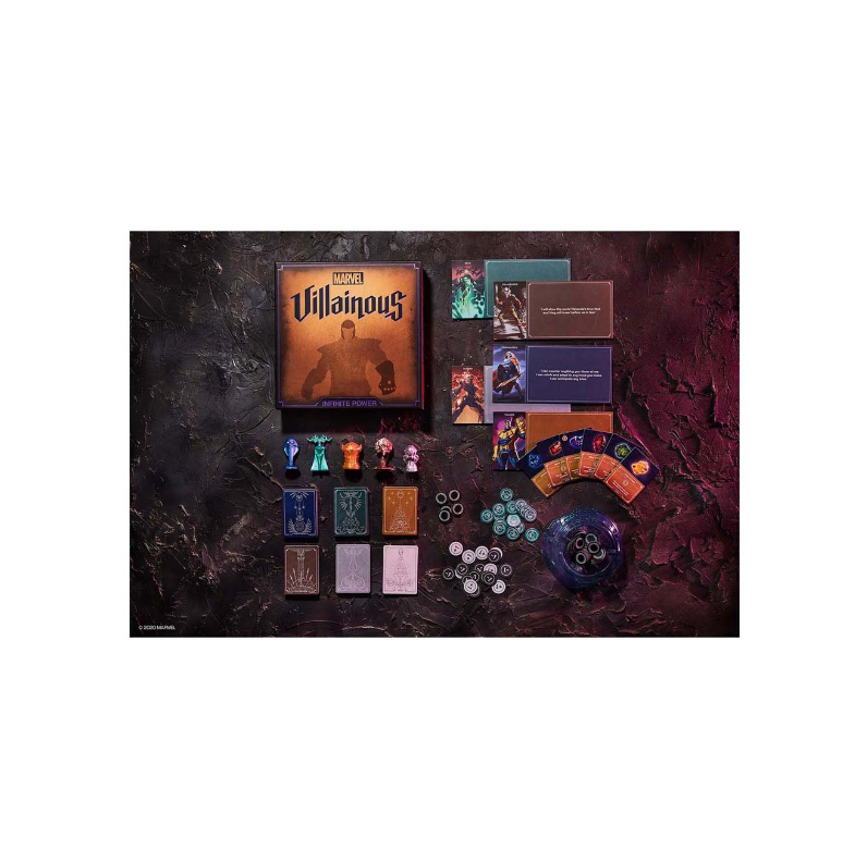 Include 5x Domenii, 5x Momente de răufăcător, 150x cărți de răufăcător, 70x cărți de soartă, 12x cărți de țiglă, 75x jetoane, 1x seif, 5x cărți de referință, 5x ghiduri și instrucțiuni pentru Villain.