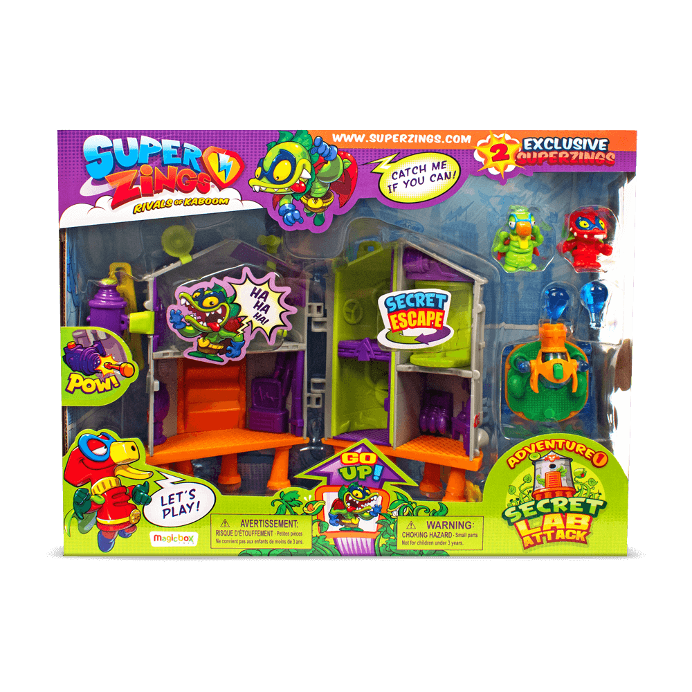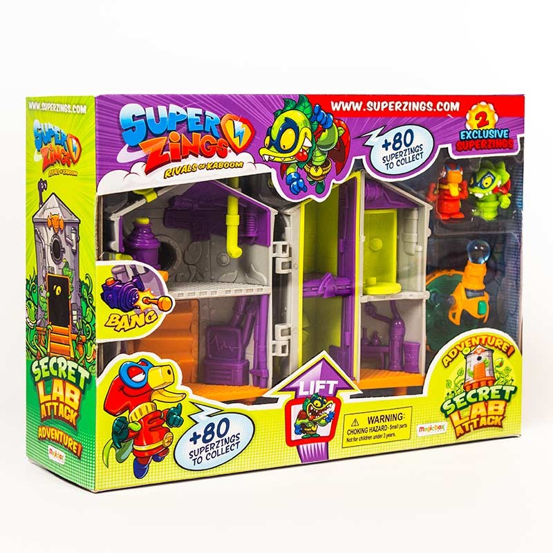Laboratorul secret SuperZings este ascuns intr-o locatie speciala din orasul Kaboom. Setul de joaca include 2 figurine SuperZings in exclusivitate, eroul Splatterman si raufacatorul Dr. Chomper. Splatterman apara laboratorul secret cu echipamentul de lupta din vehiculul sau mobil. Laboratorul are, de asemenea, un minunat lansator cu care tine raufacatorii la distanta. În interiorul acestui misterios laborator, gasim un lift care poate transporta figurinele SuperZings pe acoperis. Exista chiar si un tunel de evacuare secret, gata de utilizare in caz de urgenta.