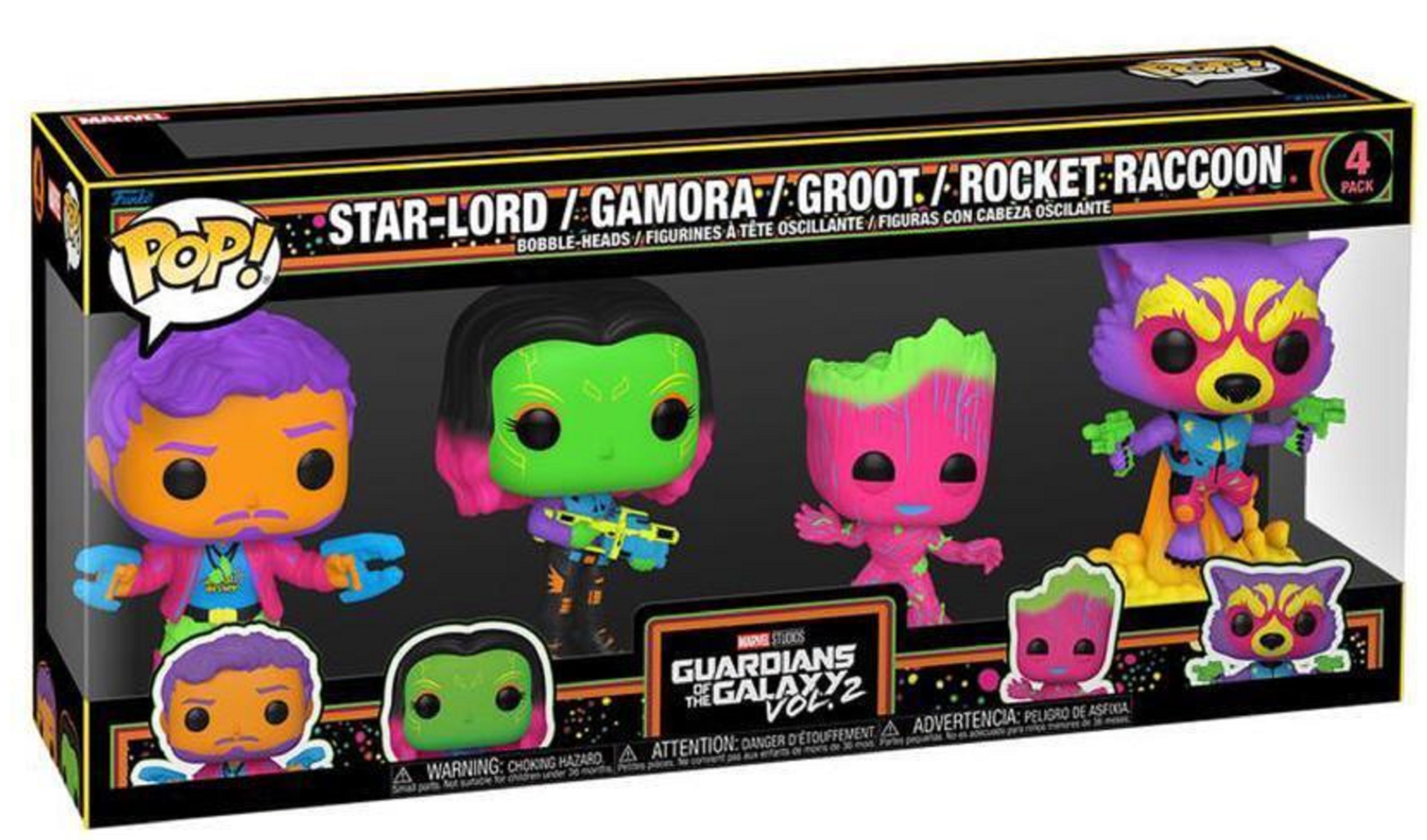 Luminează-ți colecția cu acest Blacklight Pop! Pachet de 4 figurine de vinil Star-Lord, Gamora, Groot și Rocket Raccoon. Fii atent la schemele Nebuloasei și păstrează-i pe Gardieni să protejeze Galaxia! Adaugă un pic de vitalitate colecției tale Marvel cu acest Pop! Pachet de 4 figurine de vinil!
