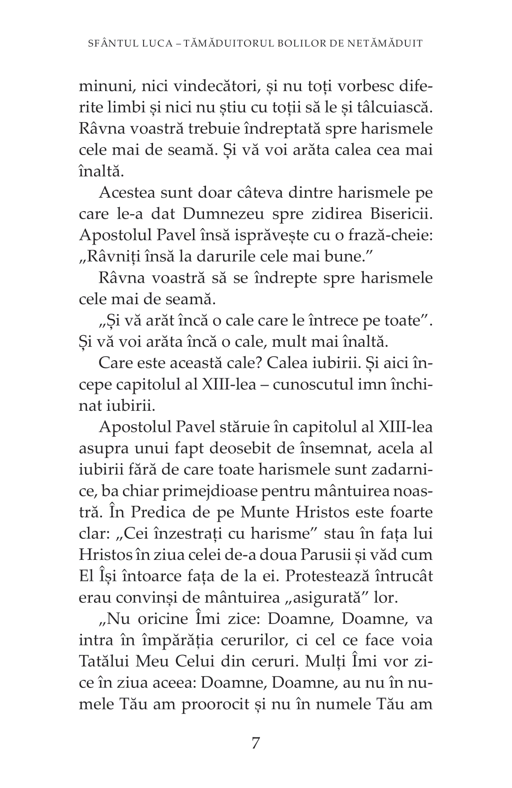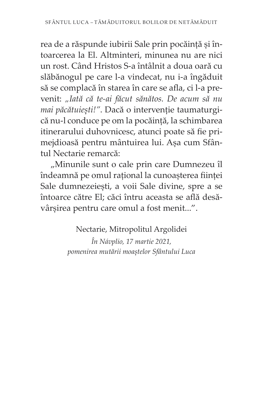De atunci am început să prețuiesc din nou viața. ­Cuprins de dragoste față de Sfântul Luca, i‑am citit viața, minunile, m‑am dus în pelerinaj la bisericile închinate lui și mi l‑am luat ca pildă, mulțumită viețuirii sale virtuoase, pline de dăruire, iubire, jertfă, tăgăduire de sine, răbdare și rugăciune. Așadar, Îi aduc mulțumire lui Dumnezeu, Care prin mijlocirea sfinților Săi ne dă nouă, nevrednicilor, vindecarea sufletelor și trupurilor ori de câte ori I‑o cerem.”