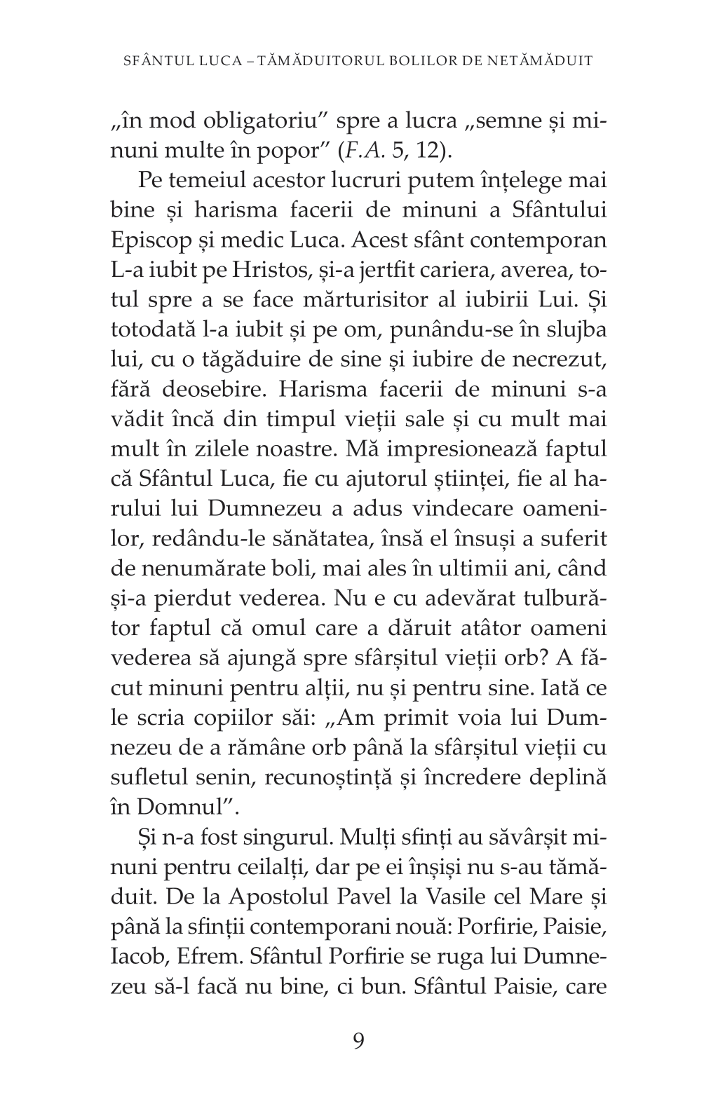 Sfântul Luca al Crimeii este viu. Aceasta e mărturia unor oameni care au simțit ocrotirea, liniștea, bucuria sfinților lui Dumnezeu și mai ales ale Sfântului Luca al Crimeii. Aceasta este puterea de Sus, dătătoare de curaj, dăruită tuturor celor ce cu credinţă trec prin nenumărate încercări. Care învață că minunea nu poate avea loc decât dacă cineva se face părtaș durerii, suferinței aproapelui întru iubirea lui Hristos.