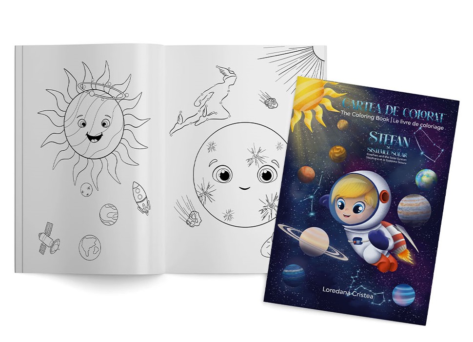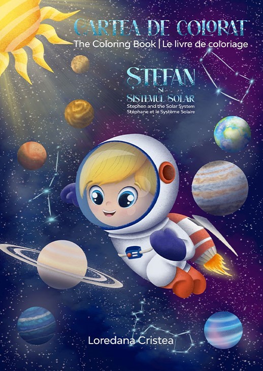 Îmbracă costumul de astronaut alături de Ştefan şi hai să ne distrăm în timp ce colorăm ilustraţiile şi învăţăm denumirile în limbile română, engleză şi franceză. Iar la sfârşit să facem şi un rebus amuzant, tot în varianta de text trilingv.