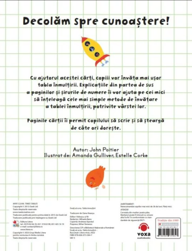 Cu ajutorul acestei cărți, copiii vor învăța mai ușor tabla înmulțirii. Explicațiile din partea de sus a paginilor și șirurile de numere îi vor ajuta pe cei mici să înțeleagă cele mai simple metode de învățare a tablei înmulțirii, potrivite vârstei lor.