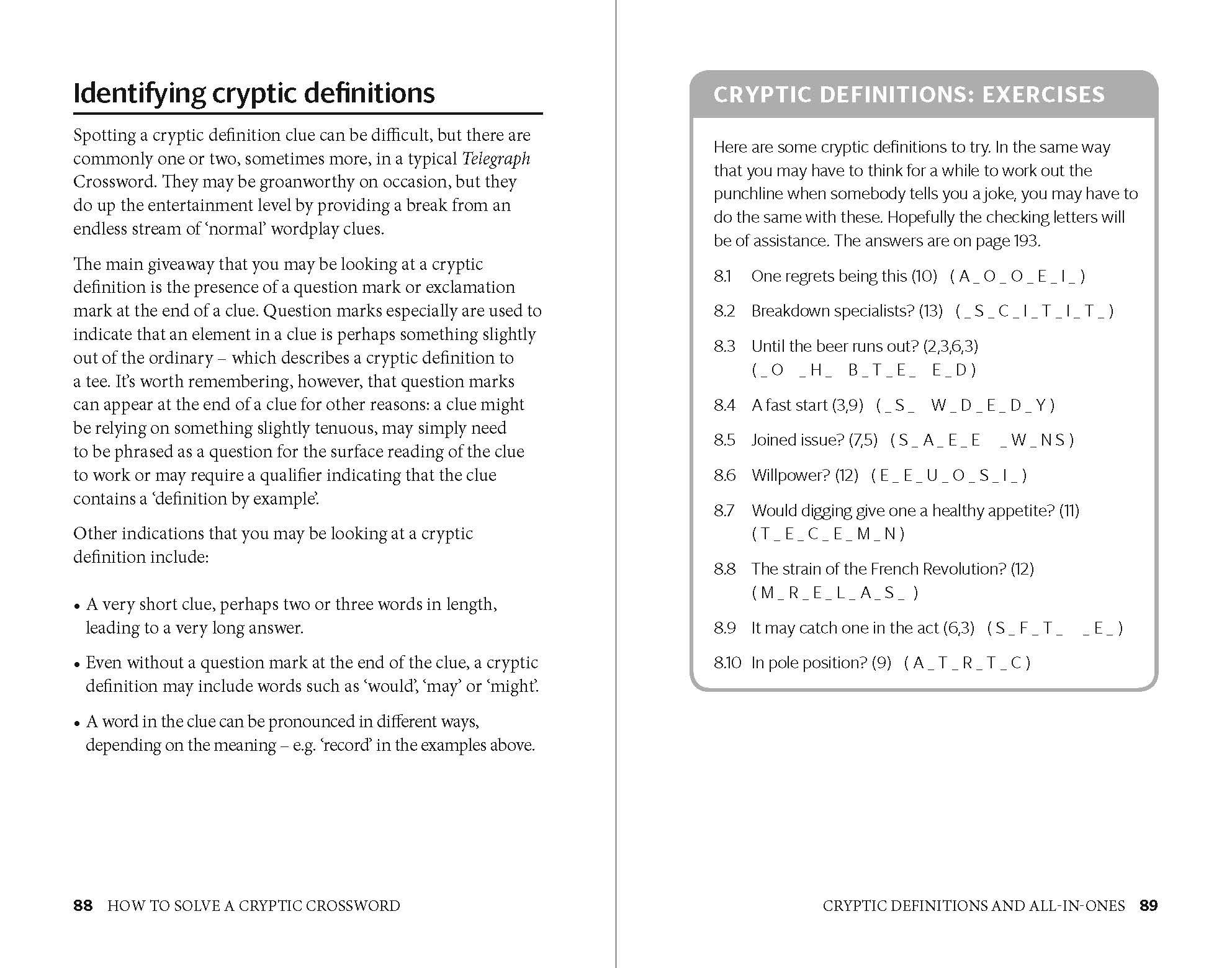 - Explanations of the common clue devices, including double definitions, hidden clues, charades, subtractions, homophones and container-and-contents clues