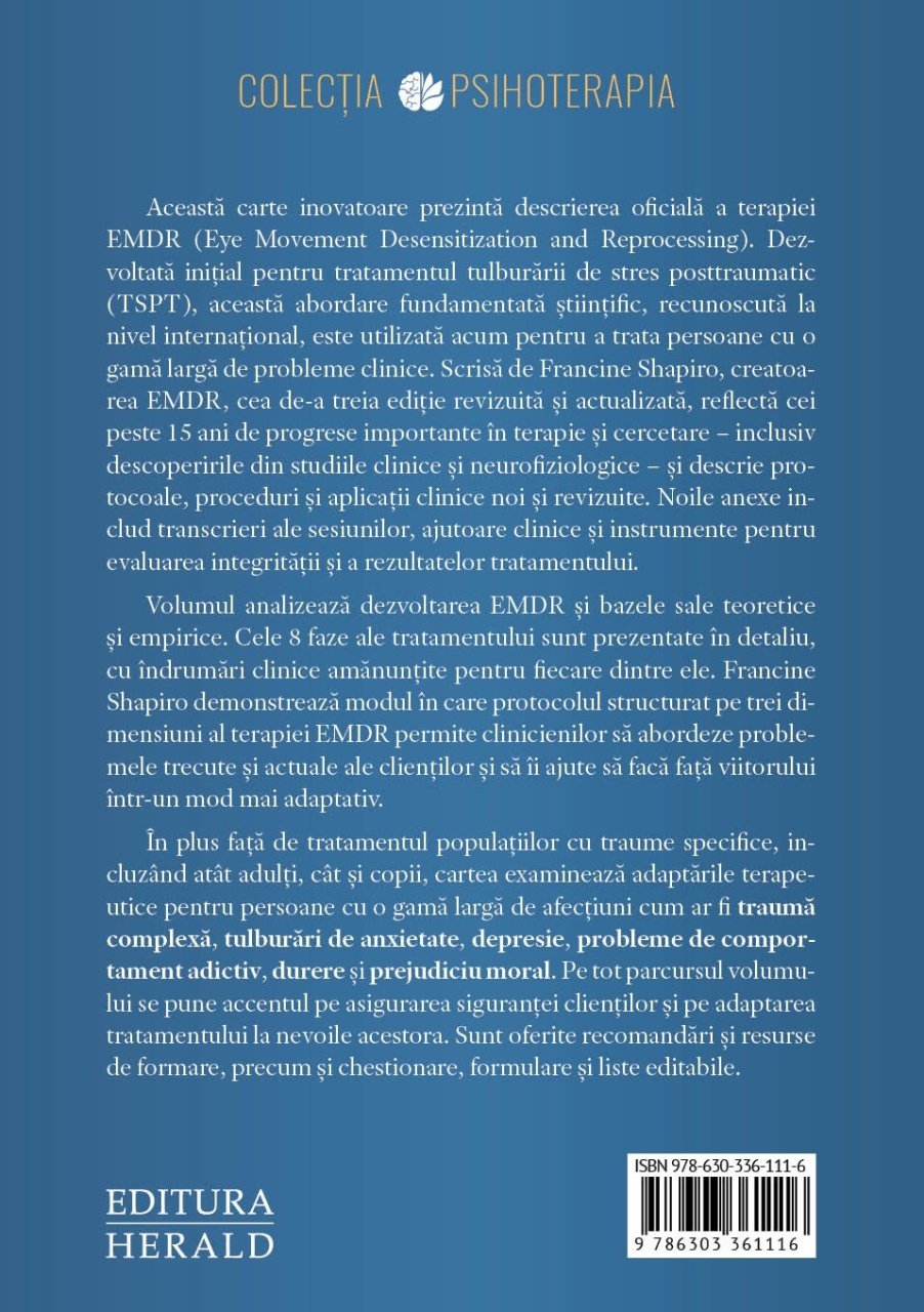 Aceasta carte inovatoare prezinta descrierea oficiala a terapiei EMDR (Eye Movement Desensitization and Reprocessing). Dezvoltata initial pentru tratamentul tulburarii de stres posttraumatic (TSPT), aceasta abordare fundamentata stiintific, recunoscuta la nivel international, este utilizata acum pentru a trata persoane cu o gama larga de probleme clinice. Scrisa de Francine Shapiro, creatoarea EMDR, cea de-a treia editie revizuita si actualizata, reflecta cei peste 15 ani de progrese importante in terapie si cercetare – inclusiv descoperirile din studiile clinice si neurofiziologice – si descrie protocoale, proceduri si aplicatii clinice noi si revizuite. Noile anexe includ transcrieri ale sesiunilor, ajutoare clinice si instrumente pentru evaluarea integritatii si a rezultatelor tratamentului.