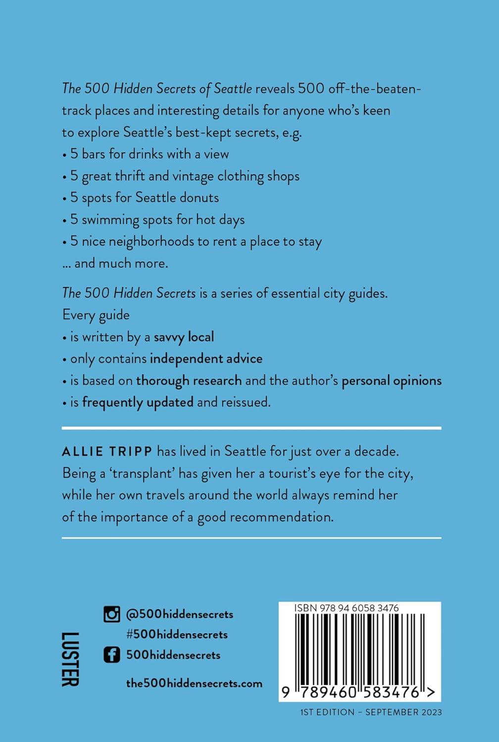 The 500 Hidden Secrets of Seattle reveals 500 off-the-beaten-track places and interesting details for anyone who’s keen to explore Seattle's best-kept secrets, e.g. 5 great places for seafood, 5 places to satisfy your sweet tooth, 5 great LGBTQ+ bars, the 5 best views in the city, 5 quirky buildings and structures, 5 swimming spots for hot days, 5 great birding spots... and much more. The 500 Hidden Secrets is a series of essential city guides. Every guide is written by a savvy local, only contains independent advice, is based on thorough research and the author's personal opinions and is frequently updated and reissued.
