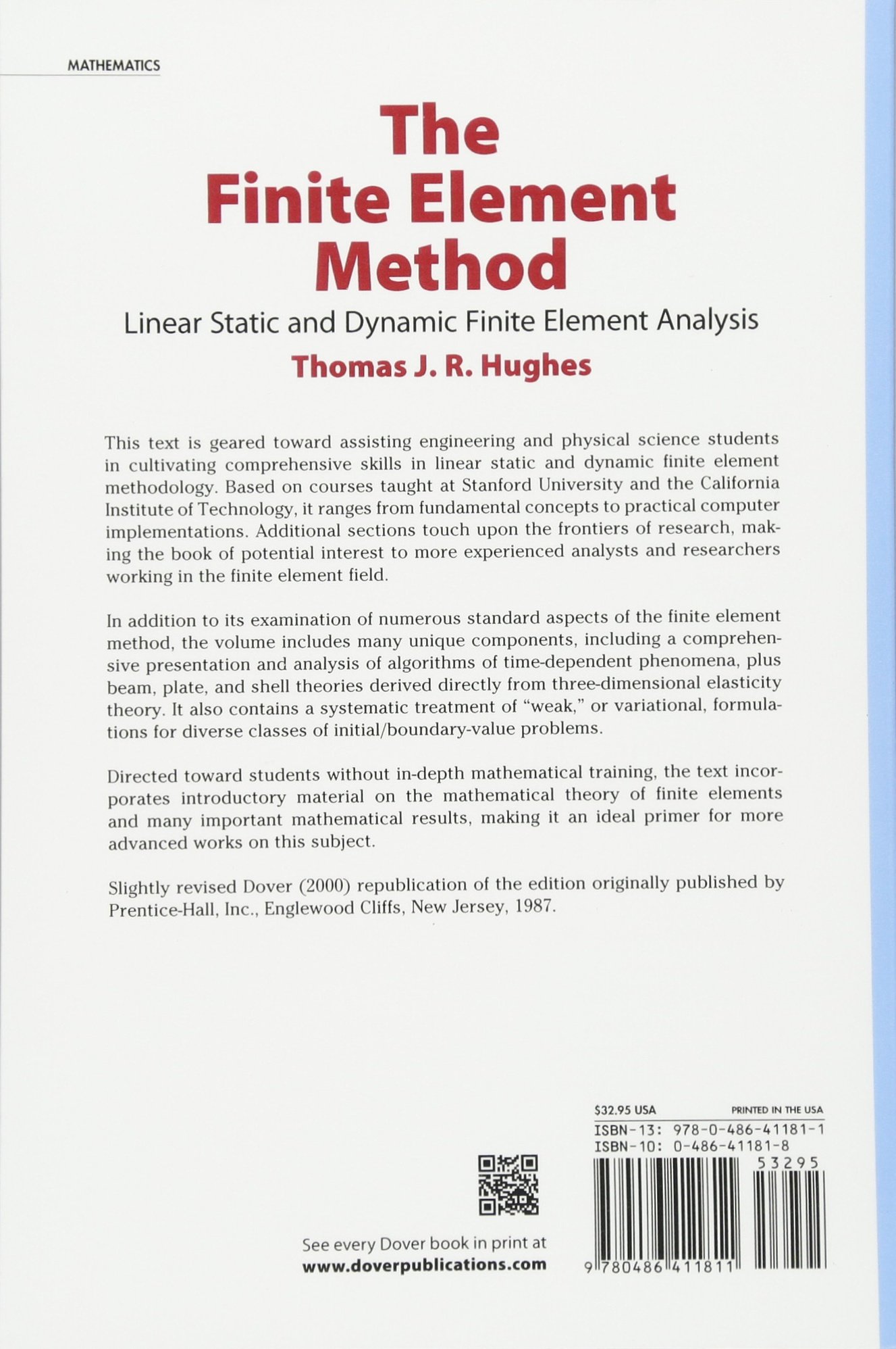 Directed toward students without in-depth mathematical training, this text cultivates comprehensive skills in linear static and dynamic finite element methodology. Included are a comprehensive presentation and analysis of algorithms of time-dependent phenomena plus beam, plate, and shell theories derived directly from three-dimensional elasticity theory. Solution guide available upon request.