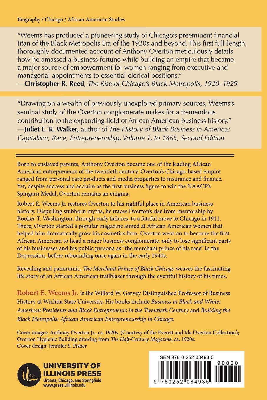 Born to enslaved parents, Anthony Overton became one of the leading African American entrepreneurs of the twentieth century. Overton's Chicago-based empire ranged from personal care products and media properties to insurance and finance. Yet, despite success and acclaim as the first business figure to win the NAACP's Spingarn Medal, Overton remains an enigma.Robert E. Weems Jr. restores Overton to his rightful place in American business history. Dispelling stubborn myths, he traces Overton's rise from mentorship by Booker T. Washington, through early failures, to a fateful move to Chicago in 1911. There, Overton started a popular magazine aimed at African American women that helped him dramatically grow his cosmetics firm. Overton went on to become the first African American to head a major business conglomerate, only to lose significant parts of his businesses-and his public persona as "the merchant prince of his race"-in the Depression, before rebounding once again in the early 1940s.Revealing and panoramic, The Merchant Prince of Black Chicago weaves the fascinating life story of an African American trailblazer through the eventful history of his times.