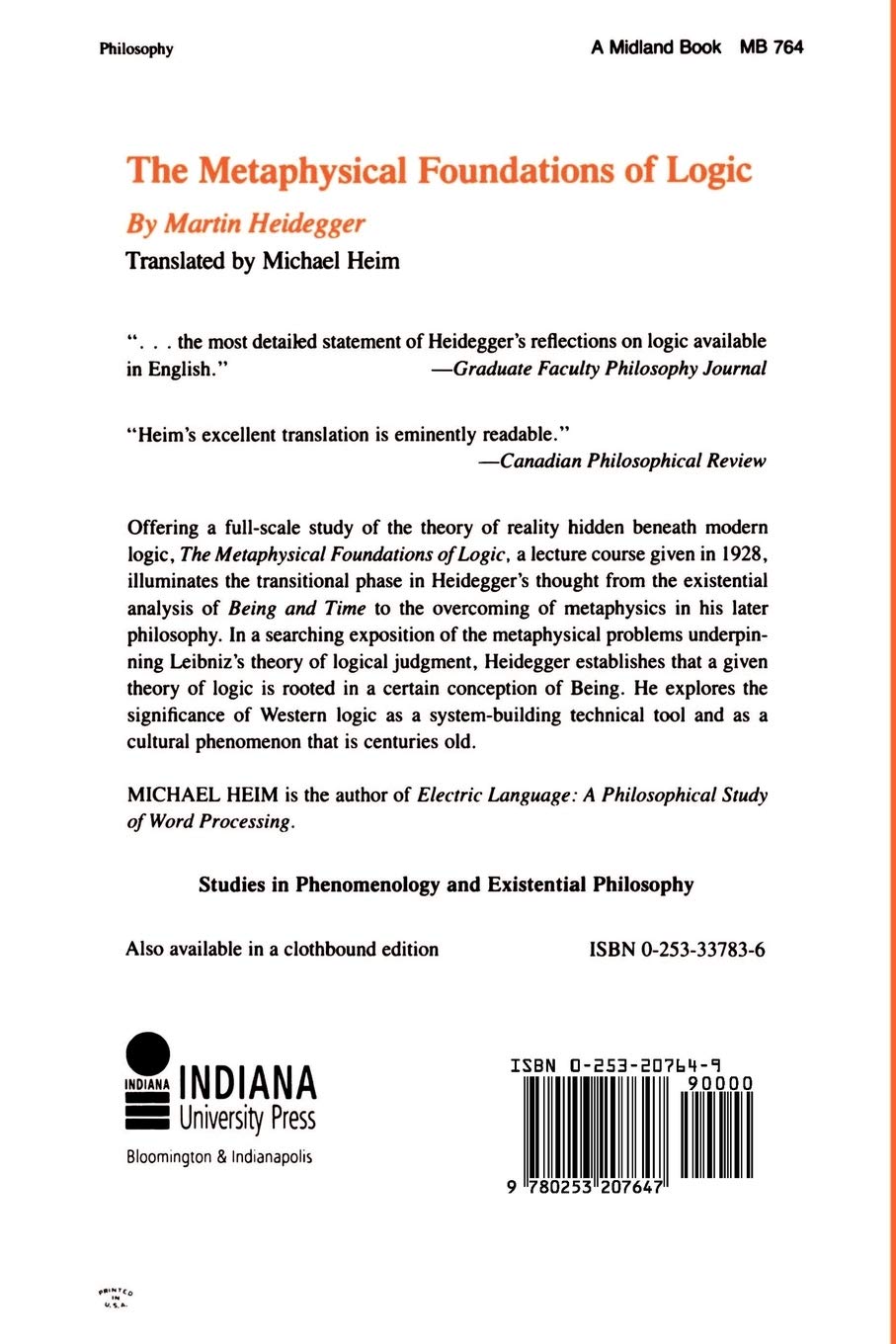 Offering a full-scale study of the theory of reality hidden beneath modern logic, The Metaphysical Foundations of Logic, a lecture course given in 1928, illuminates the transitional phase in Heidegger's thought from the existential analysis of Being and Time to the overcoming of metaphysics in his later philosophy. In a searching exposition of the metaphysical problems underpinning Leibniz's theory of logical judgment, Heidegger establishes that a given theory of logic is rooted in a certain conception of Being. He explores the significance of Western logic as a system-building technical tool and as a cultural phenomenon that is centuries old.