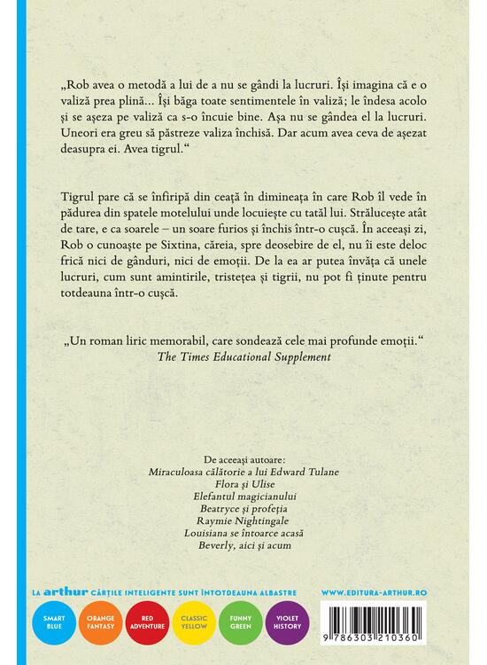 „Rob avea o metodă a lui de a nu se gândi la lucruri. Îşi imagina că e o valiză prea plină... Îşi băga toate sentimentele în valiză; le îndesa acolo și se aşeza pe valiză ca s-o încuie bine. Așa nu se gândea el la lucruri. Uneori era greu să păstreze valiza închisă. Dar acum avea ceva de aşezat deasupra ei. Avea tigrul."