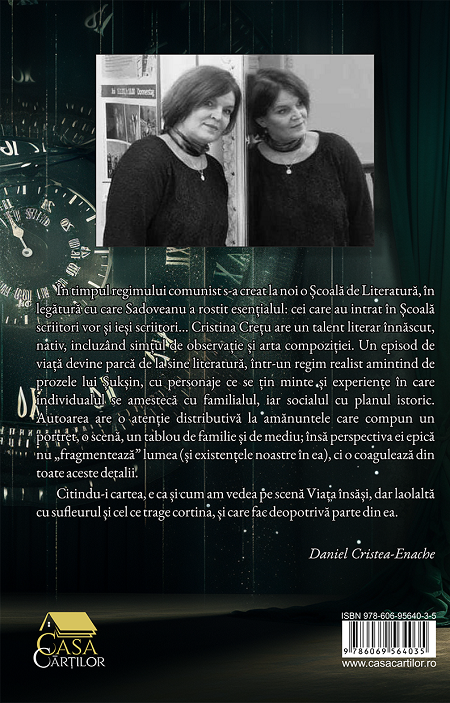 „Cristina Crețu are un talent literar înnăscut, nativ, incluzând simțul de observație și arta compoziției. Un episod de viață devine parcă de la sine literatură, într-un regim realist amintind de prozele lui Șukșin, cu personaje ce se țin minte și experiențe în care individualul se amestecă cu familialul, iar socialul cu planul istoric. Autoarea are o atenție distributivă la amănuntele care compun un portret, o scenă, un tablou de familie și de mediu; însă perspectiva ei epică nu „fragmentează” lumea (și existențele noastre în ea), ci o coagulează din toate aceste detalii.