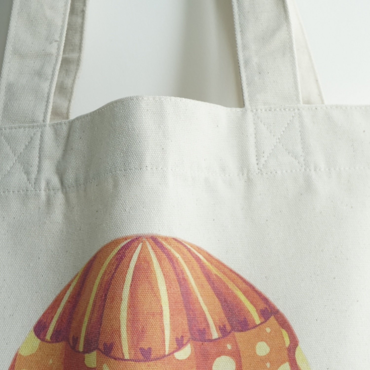 Tote bag-ul este croit din bumbac gros, are o culoare deschisa (natur) si print-ul este realizat direct in tesatura.