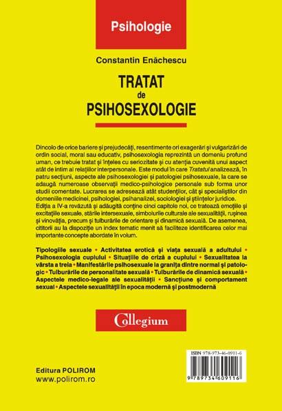 Dincolo de orice bariere si prejudecati, resentimente ori exagerari si vulgarizari de ordin social, moral sau educativ, psihosexologia reprezinta un domeniu profund uman, ce trebuie tratat si inteles cu seriozitate si cu atentia cuvenita unui aspect atit de intim al relatiilor interpersonale. Este modul in care Tratatul analizeaza, in patru sectiuni, aspecte ale psihosexologiei si patologiei psihosexuale, la care se adauga numeroase observatii medico-psihologice personale sub forma unor studii comentate. Lucrarea se adreseaza atit studentilor, cit si specialistilor din domeniile medicinei, psihologiei, psihanalizei, sociologiei si stiintelor juridice.
