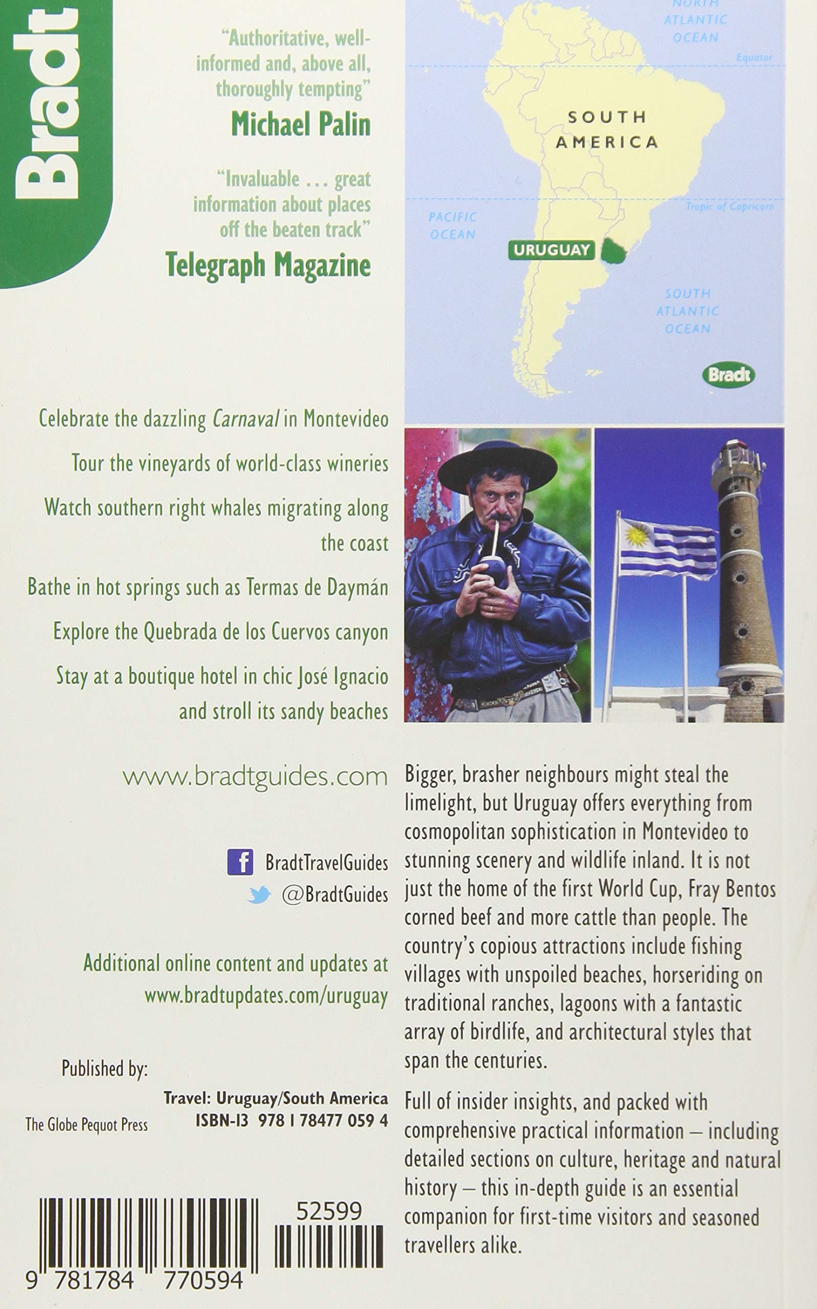 This new, fully updated third edition of Bradt's Uruguay remains the only dedicated English-language guide to a country that's small yet bursting with character. Bradt's Uruguay provides in-depth coverage of the capital Montevideo, where the once-derelict colonial Old City is undergoing a historic resurgence, plus detailed information on the UNESCO-listed coastal city of Colonia del Sacramento, as well as Punta del Este, where the Buenos Aires glitterati decamps to the beaches each summer. There's advice, too, for active travellers who can rattle their whips on cattle-ranching estancias and spin their sticks in a game of polo or two and for nature enthusiasts keen to watch wildlife in the western wetlands and birds in Cabo Polonio and Santa Teresa.