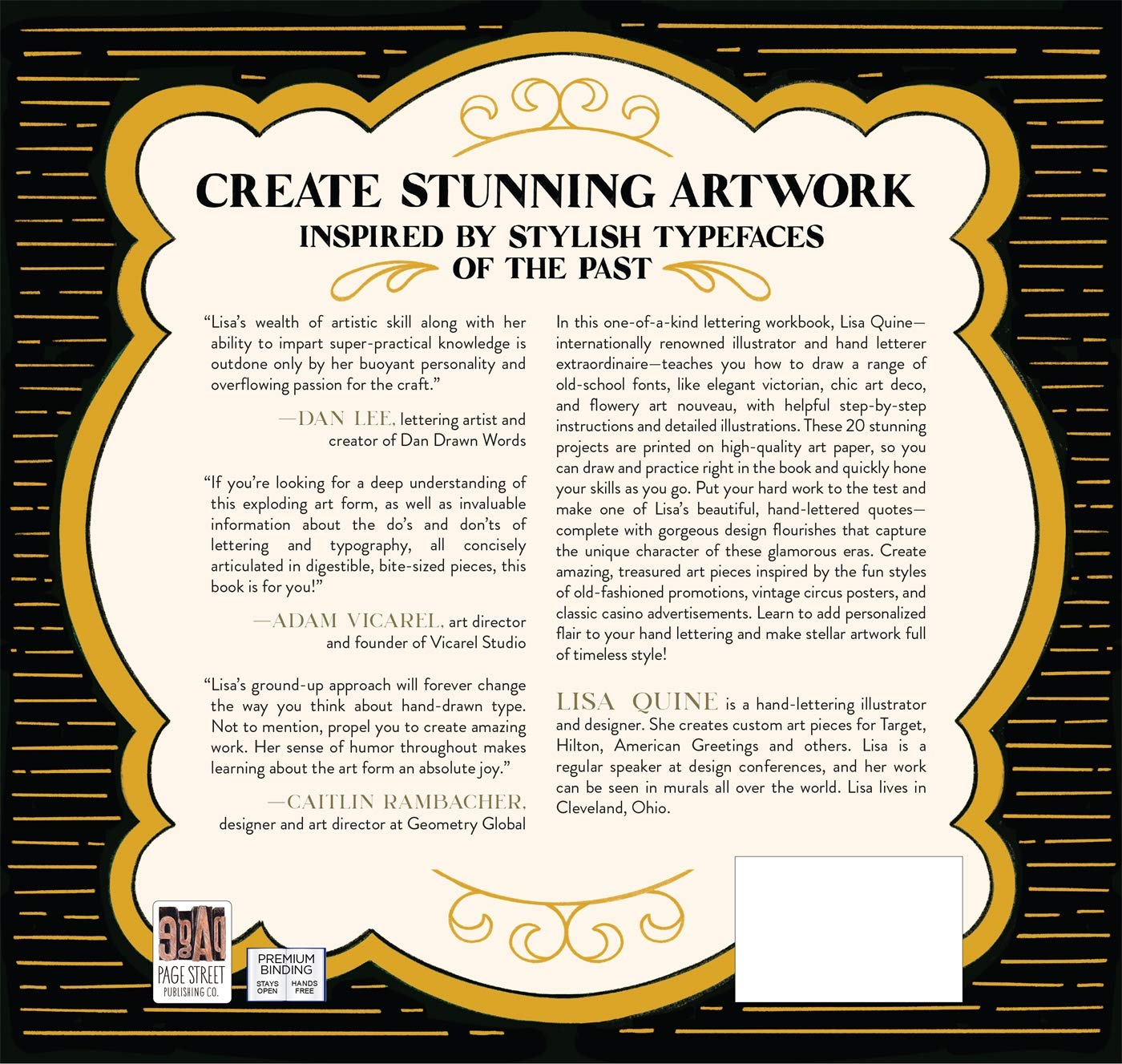 Lisa Quine, known for her breathtaking, hand-lettered murals and dazzling vintage-style fonts shows readers the easy way to create unique hand-drawn typefaces. Hand lettering has exploded in popularity, whether displayed online, used for signage and branding, or in personal art, and vintage lettering openings up a world of possibilities. Readers learn Art Deco and Art Nouveau style fonts, how to add Victorian flourishes, and how to incorporate florals into their letters. Lisa breaks down each font, no matter how elaborate, and makes it approachable for readers of all levels by starting simple and adding variations and embellishments