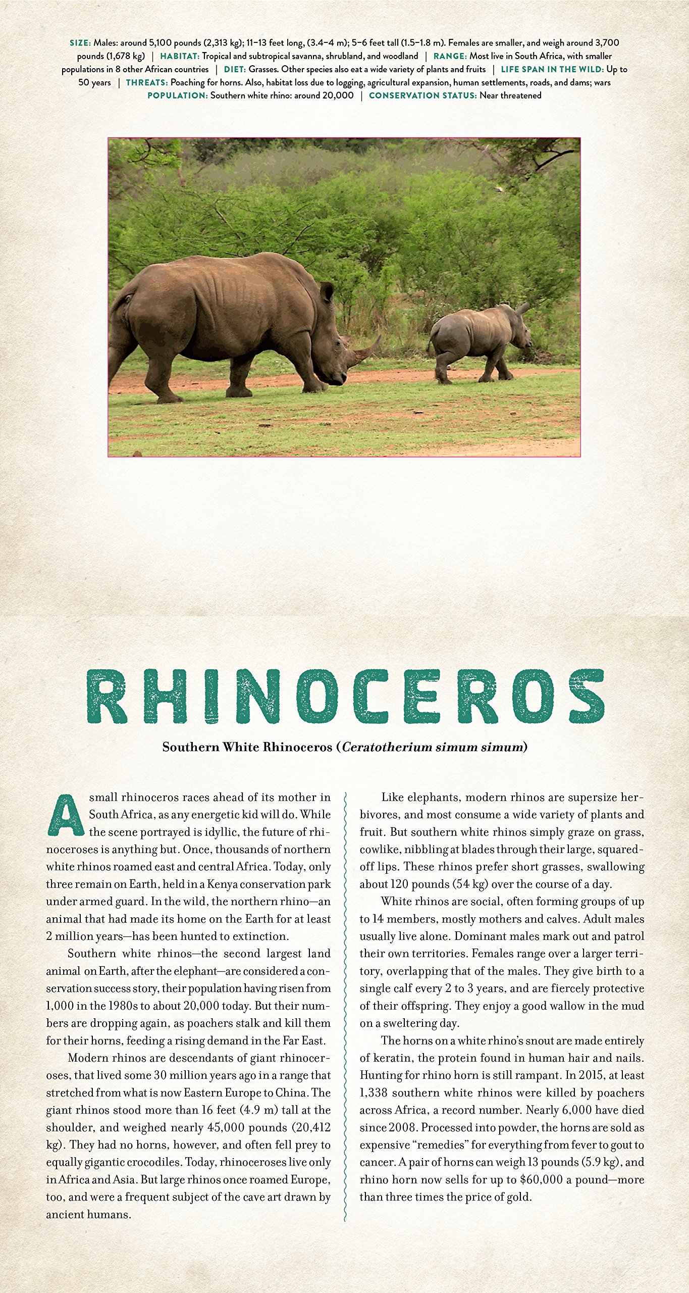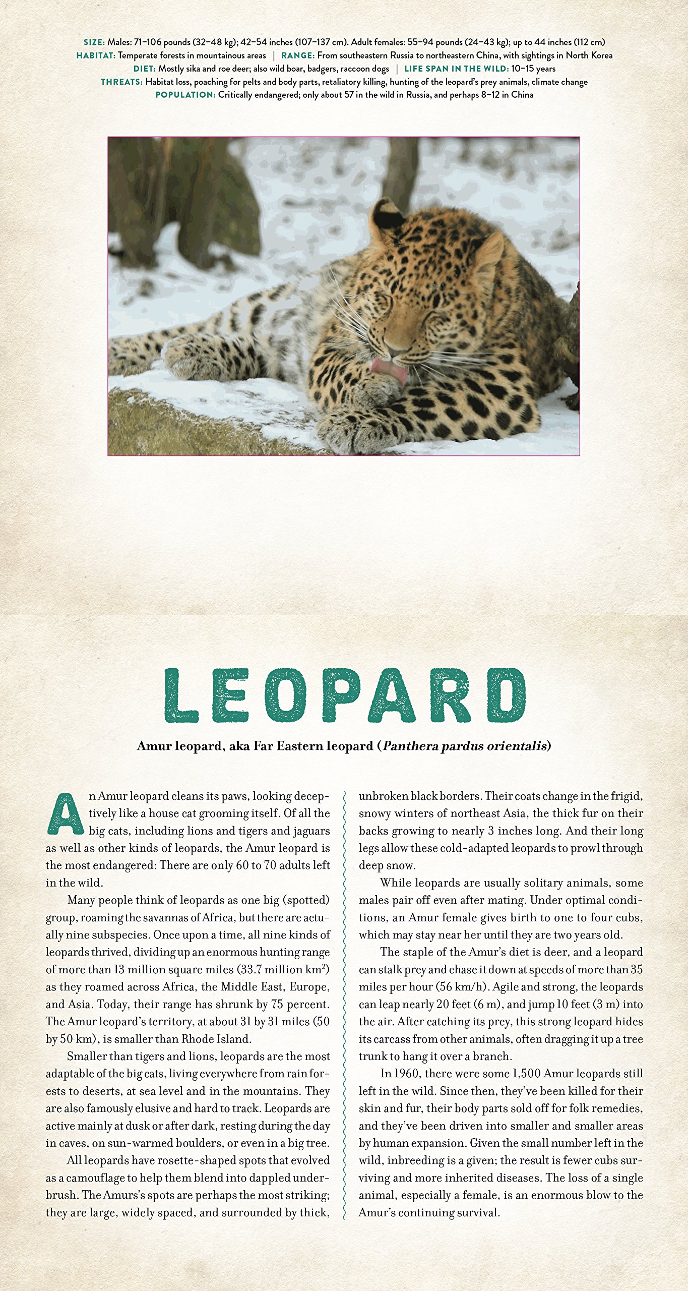 The opening essay focuses on conservation efforts around the world and answers the question: What exactly does it mean to protect or save an endangered animal? It includes stories of interesting and unique conservation efforts, including some inspiring success stories. The profile accompanying each animal image include information on conservation efforts for that particular species. Animals featured include: Amur Leopard, Pangolin, Panda, Honey Bee, Elephant, Rhinoceros, Albatross, Gorilla.