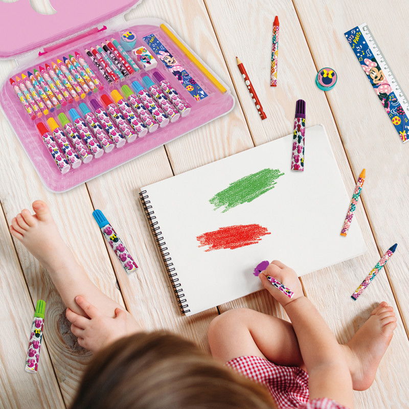 Desenează, pictează și creează oriunde te-ai afla cu AS Art Case Minnie. Realizează o schiță și apoi colorează-o alegând culoarea preferată dintre markerele sau creioanele din trusă.