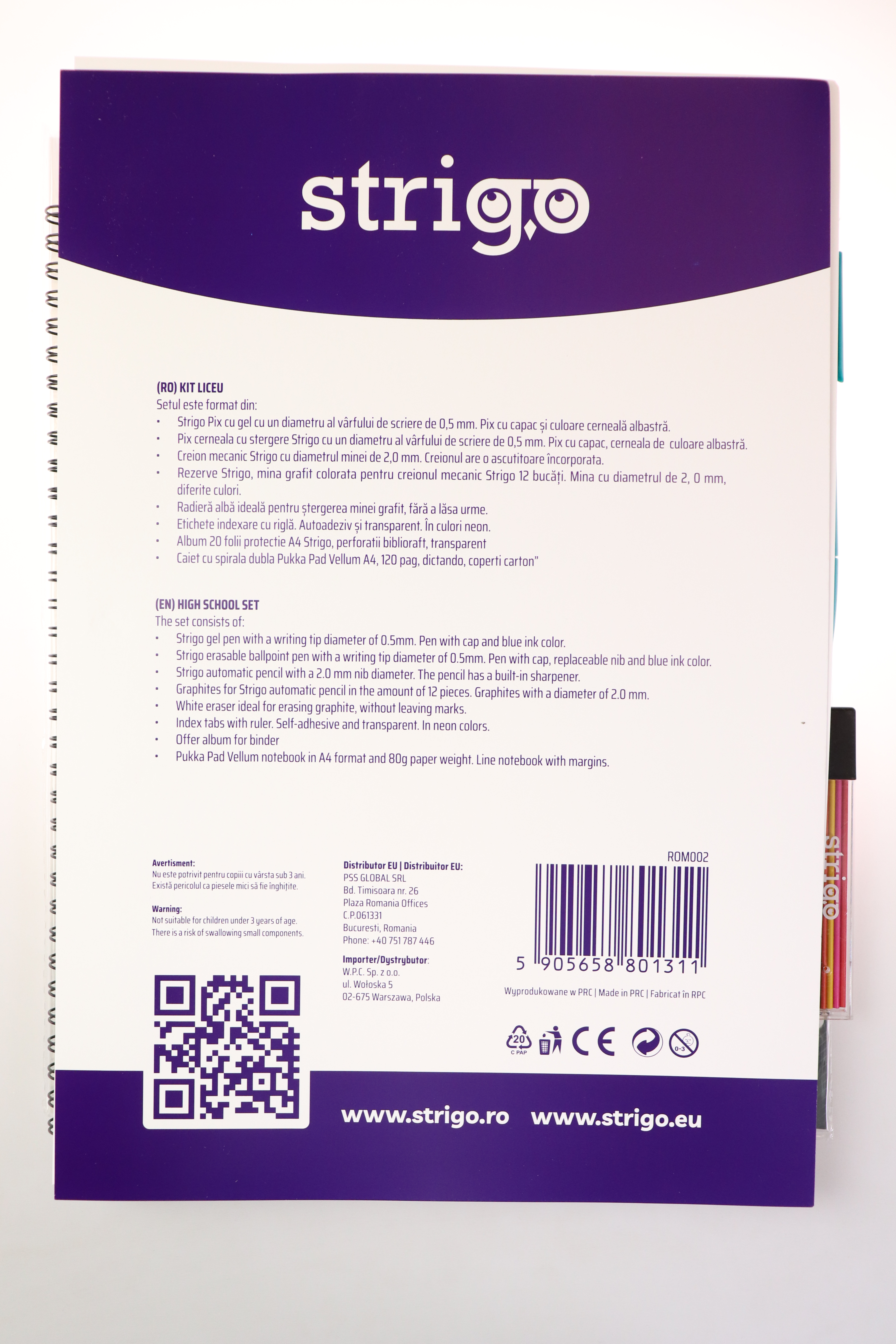- Pix cerneala cu stergere Strigo cu un diametru al vârfului de scriere de 0,5 mm. Pix cu capac, cerneala de culoare albastră.