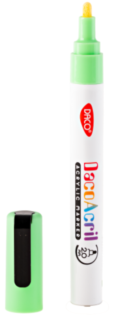 Marker acrilic, Verde Fluorescent, 1 buc, Daco [6425871048427] Markerul acrilic DACO într-o nuanță vibrantă de verde fluorescent este alegerea perfectă pentru adăugarea unui pop de culoare proiectelor tale artistice și de decorare. Cu cerneală pe bază de apă, acest marker oferă o putere mare de acoperire și rezistență la apă, fiind potrivit pentru pictură și decorare pe o varietate de suprafețe, inclusiv lemn, plastic, sticlă și metal.