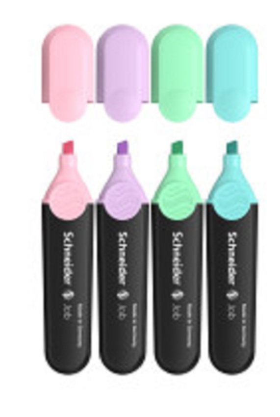 Textmarker Schneider Job Pastel, perfect pentru evidentiere pe hartie standard, de copiator si de fax. Poate evidentia mai mult de 15.000 de cuvinte. Culori trendy, pastelate, puternic vizibile, cu stralucire maxima. Produs premiat cu iF si Reddot Design Award.