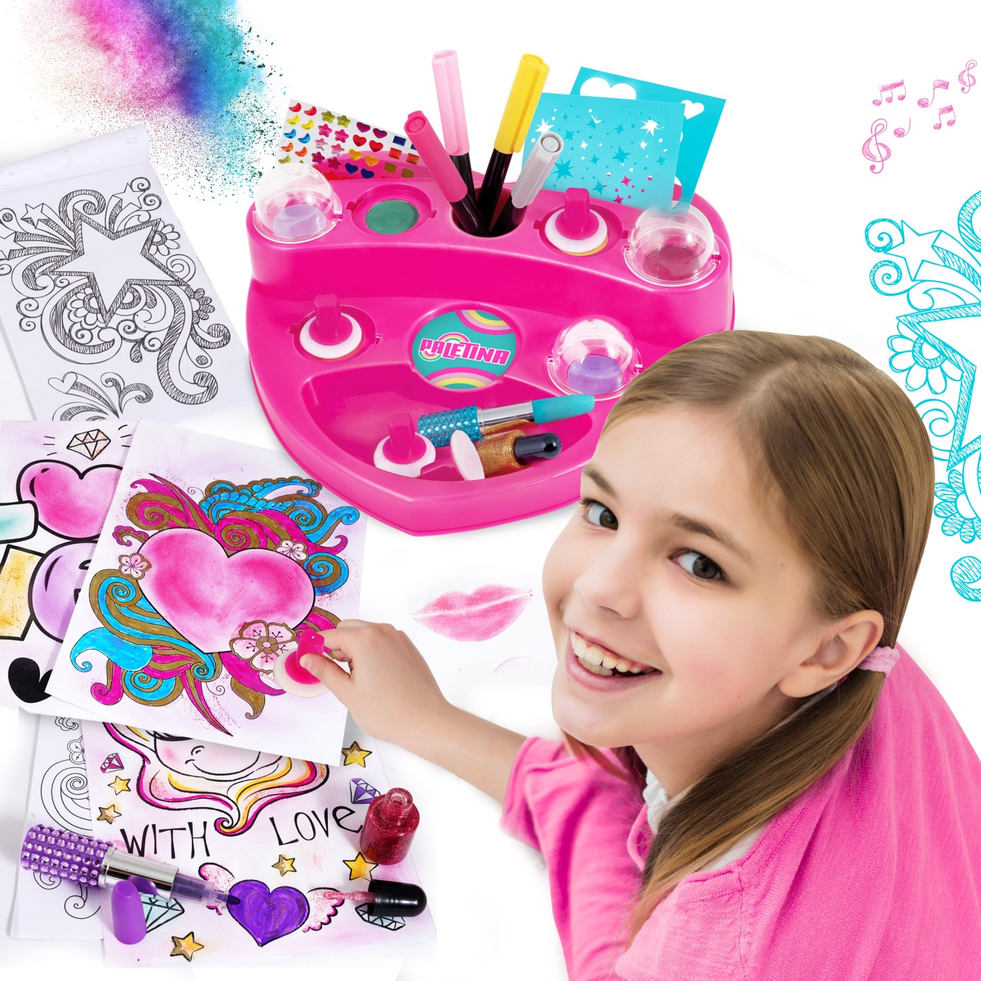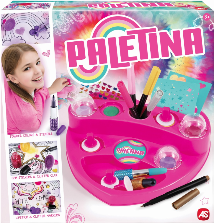 Este o alegere ideala pentru un cadou, deoarece ii ofera copilului nenumarate optiuni pentru a-si exersa creativitatea cu diverse tehnici de pictura, dezvoltandu-si in acelasi timp imaginatia. Include: 1 paleta de pictura in forma de inima, 6 vopsele pudra, 6 pensule burete, 6 foi de sablon, 5 markere (cu sclipici si de culoare), 2 markere ruj, 2 borcane de lipici cu sclipici, bloc de desen si stickere cu pietre pretioase