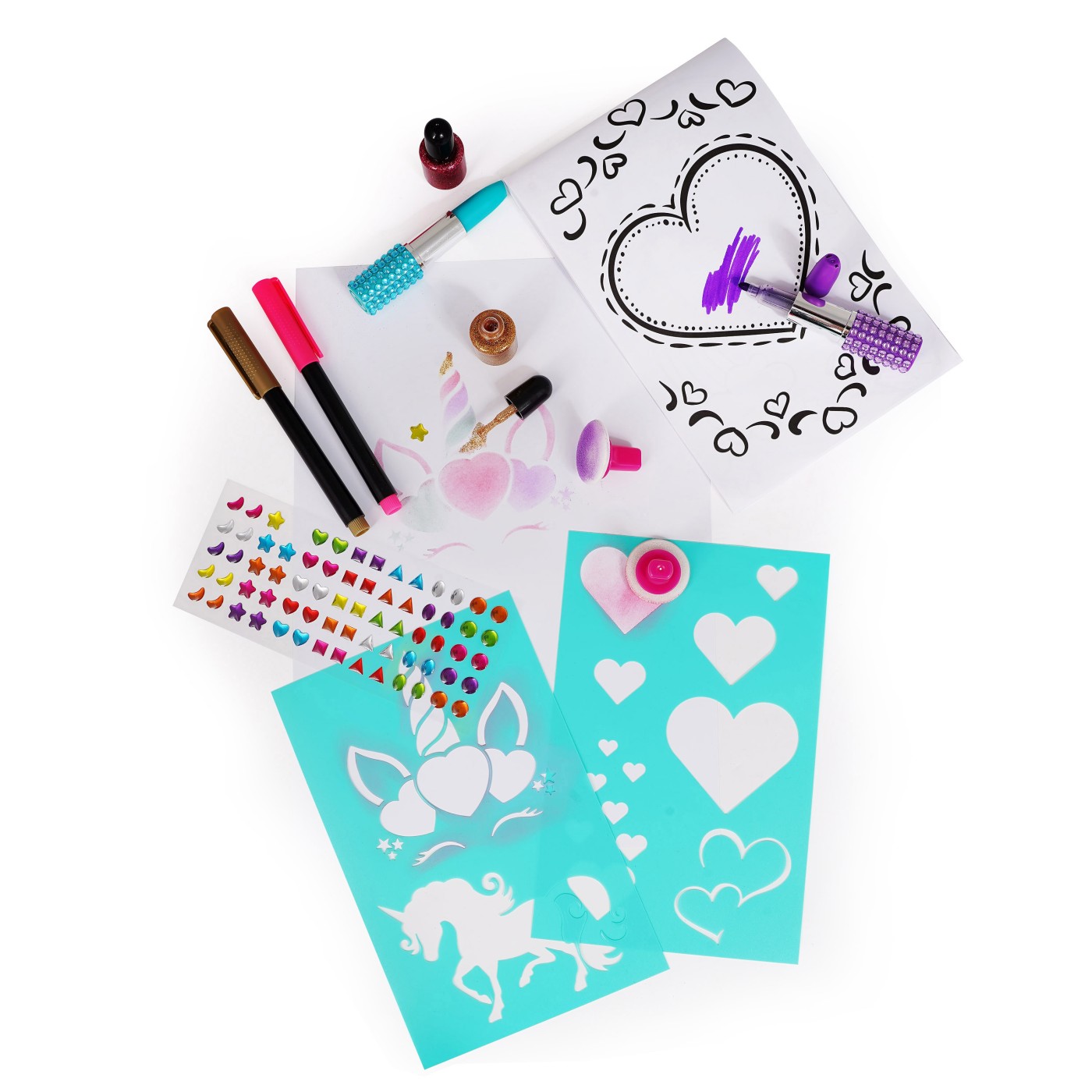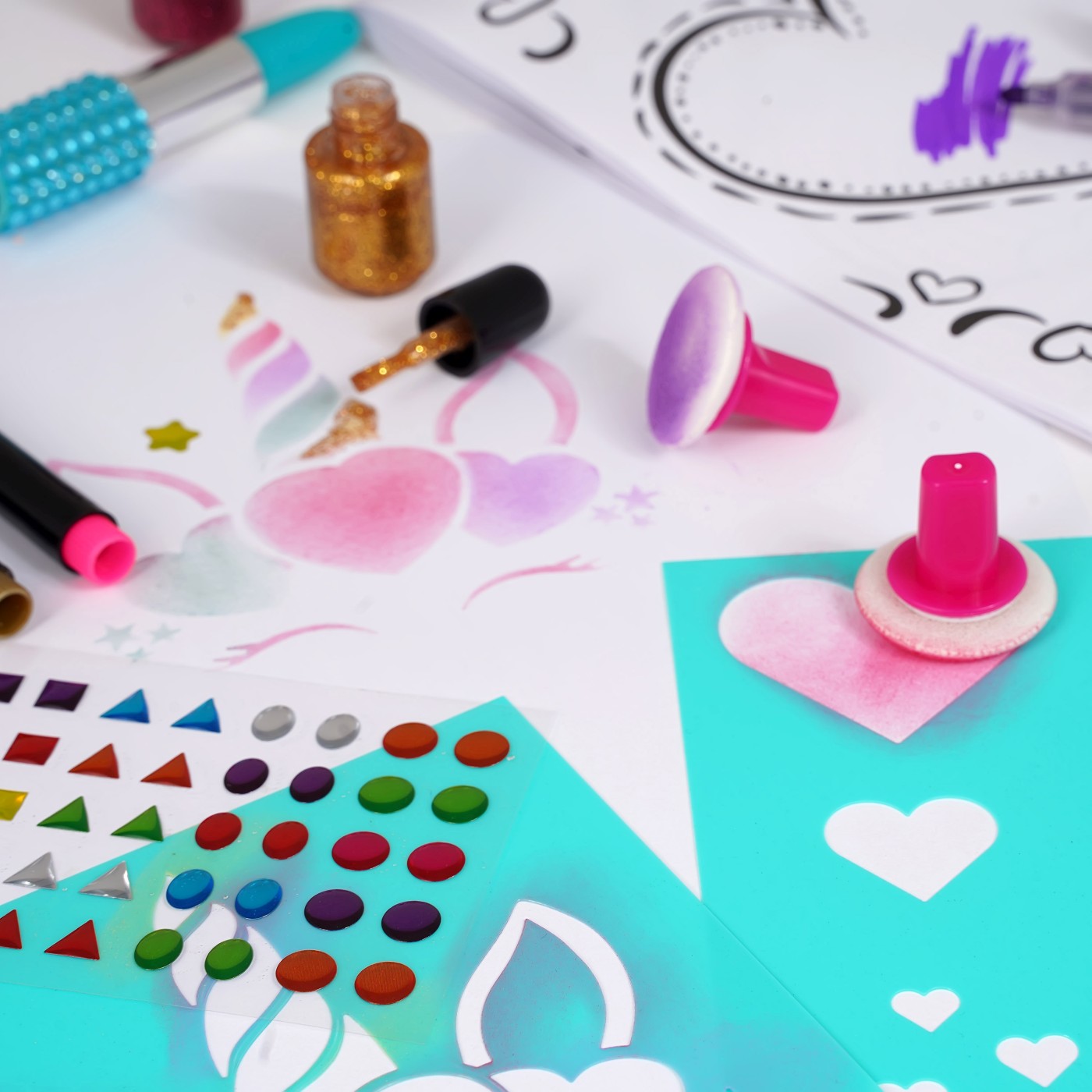 Vopsele pudra, markere, pensule, sclipici, stickere cu pietre pretioase, bloc de desen si sabloane pentru desene minunate sunt incluse pentru ca cel mic sa deseneze fara sa se opreasca! Deseneaza-ti proprii unicorni, stele, inimi si alte desene magice cu ajutorul pudrelor de pictura si decoreaza-le cu sclipici si autocolante.