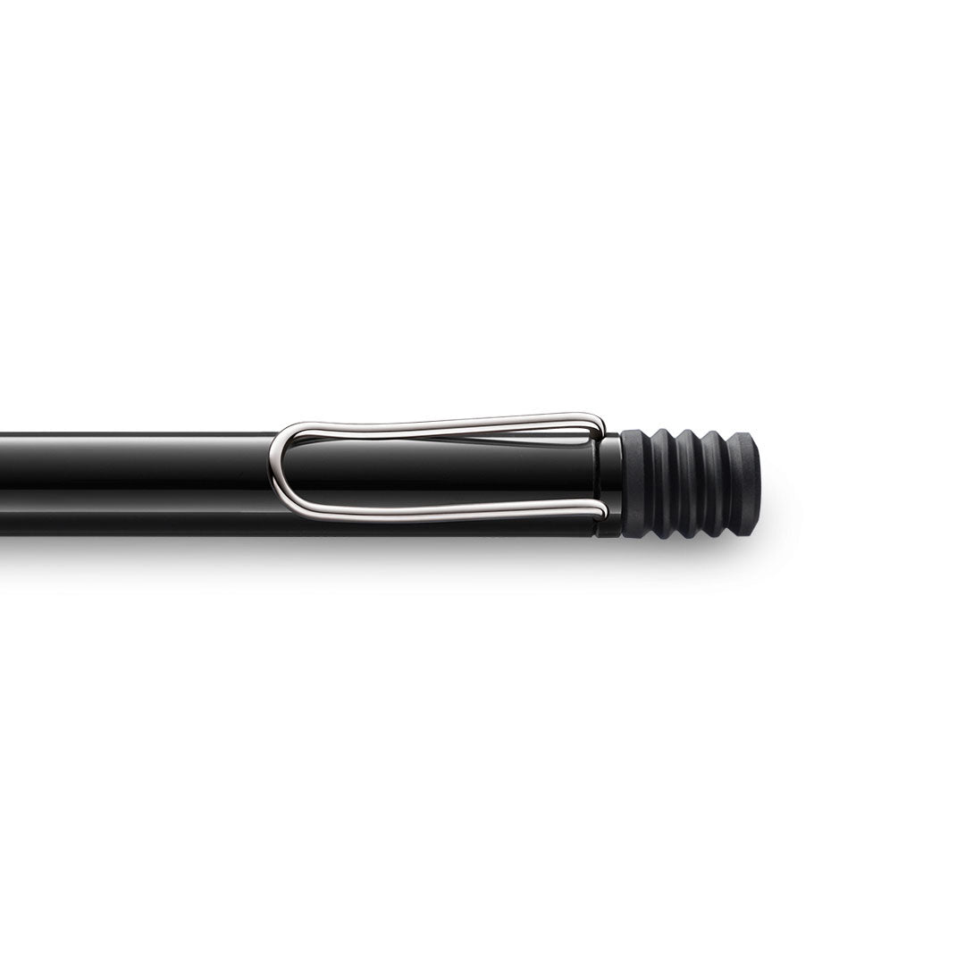 Detalii pix cu mecanism Lamy Safari: plastic rezistent finisaj shiny black/ clip metalic / grip ergonomic / rezervă pix Lamy M16.