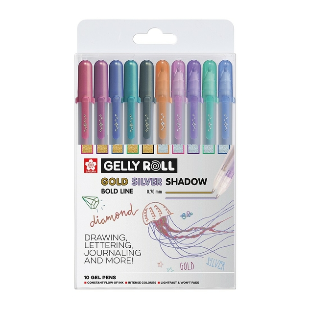 Setul de 10 pixuri Gelly Gold & Silver Shadow de la Sakura este alegerea ideala pentru cei care doresc sa adauge o nota de eleganta si stil scrisului zilnic sau proiectelor creative. Aceste pixuri sunt concepute pentru a oferi linii cu un efect dublu unic: scriere aurie si argintie, fiecare litera fiind inconjurata de margini colorate vibrante. Acest efect de umbra colorata face ca fiecare cuvant sau desen sa capete o dimensiune artistica si un aspect distinctiv, fiind perfecte pentru scrapbooking, decoratiuni, notite speciale sau chiar invitatii personalizate.