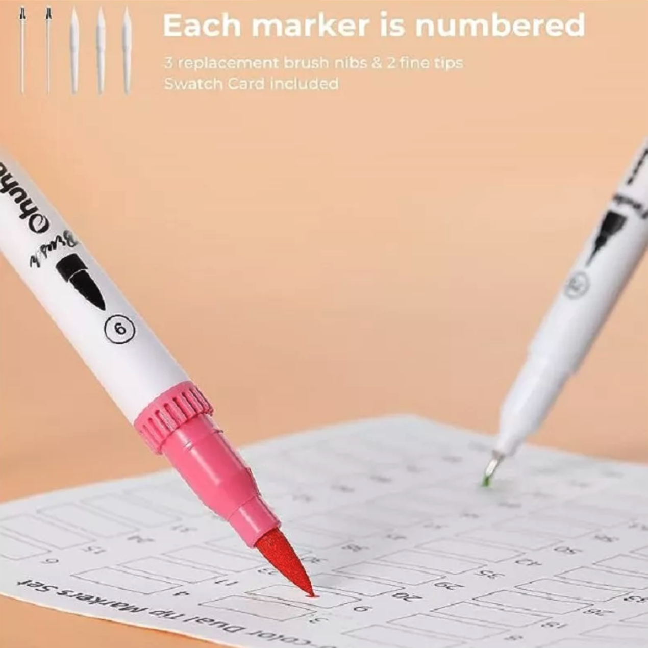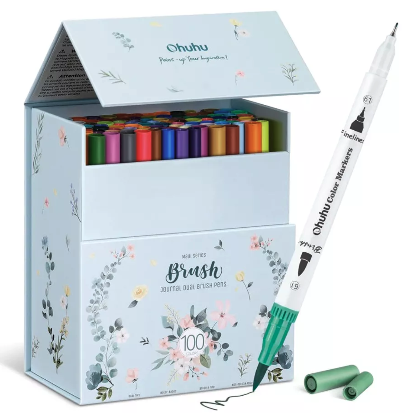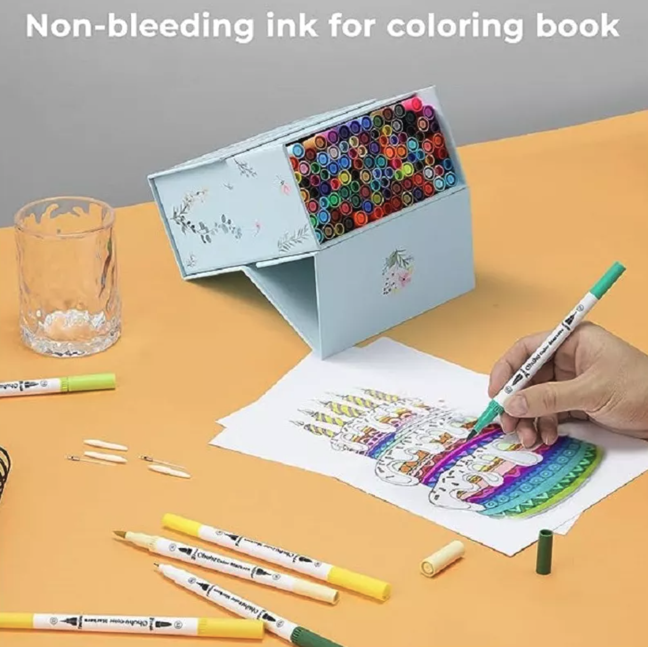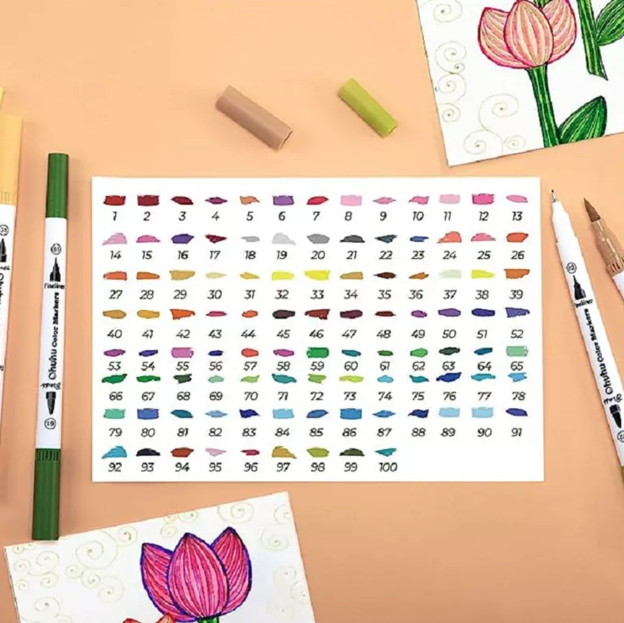Descoperă creativitatea fără limite cu acest set complet de 100 de markere Ohuhu, pe bază de apă, cu două capete: un vârf tip pensulă pentru linii fluide, umbre și detalii expresive, și un vârf fin pentru contururi precise, scris de mână și desen tehnic.