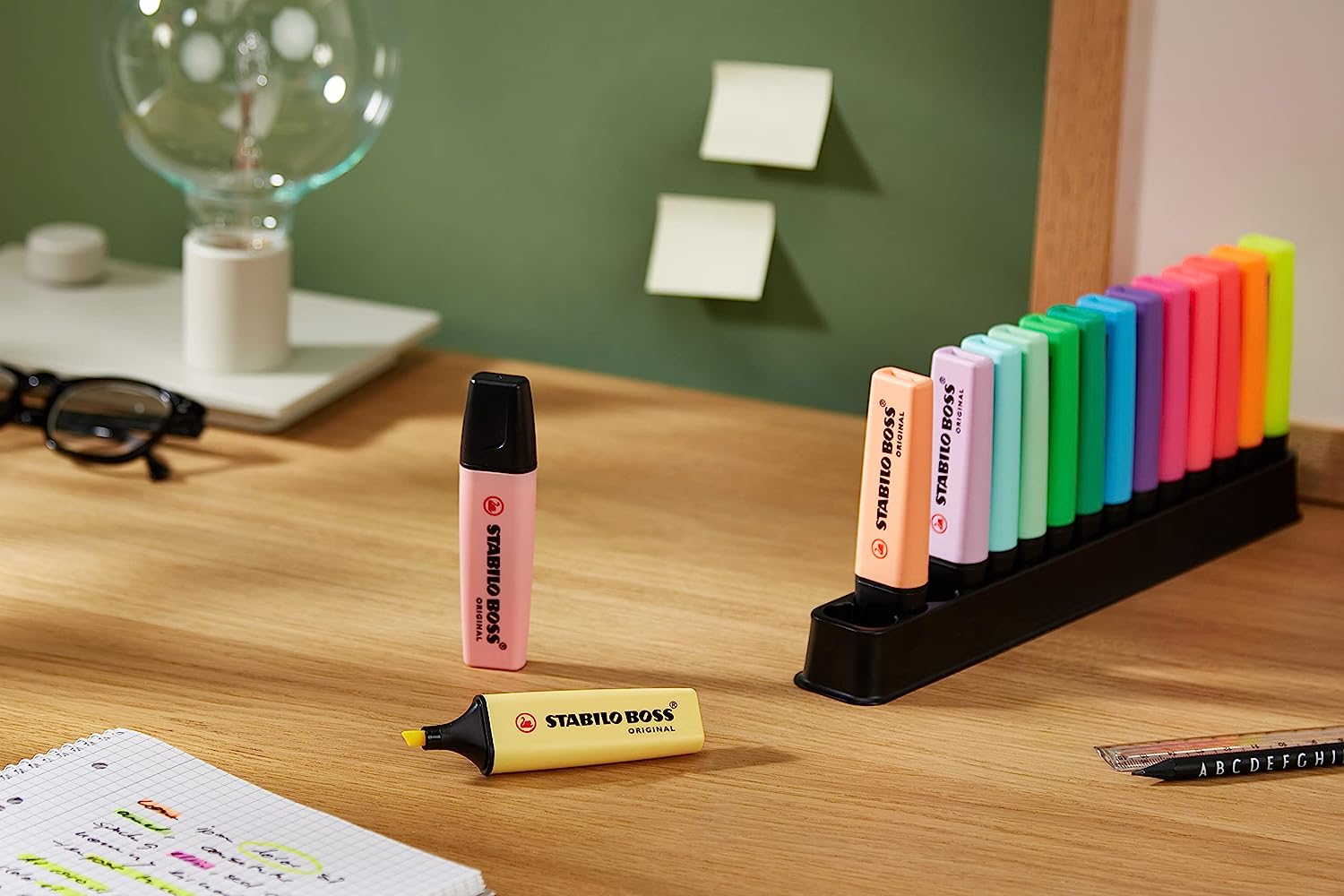 Stabilo BOSS ORIGINAL este un evidentiator neon emblematic din 1971. Mai mult decat markere functionale, acestea sunt accesorii la moda care va permit sa va exprimati cu adevarat. Dispunand de tehnologia noastra obisnuita de calitate inalta, Stabilo Anti-Dry-Out (pana la patru ore) si cerneluri pe baza de apa, aceste evidentiatoare sunt perfecte pentru scoala, facultate, afaceri sau hobby. Apropo: colectia noastra pastel este inclusa si la celelalte game Stabilo point 88, Stabilo Pen 68 si Stabilo pointMax. A iesi in evidenta!