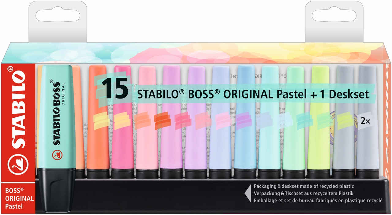 Set Textmarkere Stabilo Boss Original, culori asortate pastel cu suport de birou, 15 buc/set