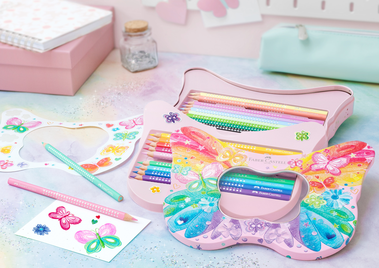 Creioane colorate cu efect stralucitor. Cutii metalice de inalta calitate. Aplicare usoara a culorii. Mina rezistenta la rupere datorita procesului de lipire securizata (SV). Forma ergonomica triunghiulara. Culorile se pot spala de pe majoritatea textilelor. Lemn din surse sustenabile. Vopsea pe baza de apa pentru protejarea mediului inconjurator. Productie carbon-neutra. Cutie in forma de fluture, stickere cu fluturi incluse. Cutie continand 12 creioane colorate standard si 8 creioane colorate pastel.