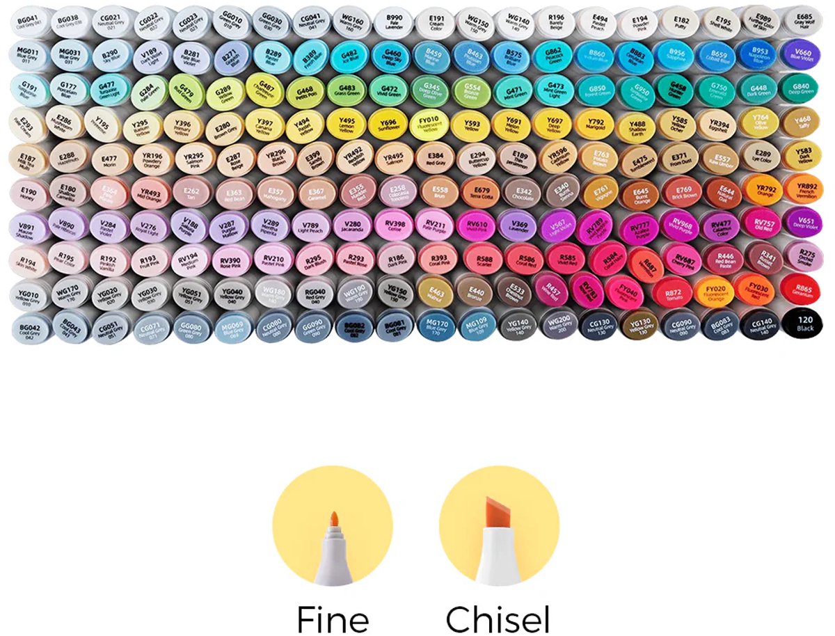 Set 200 markere - Dual Tips & Chisel au cerneală pe bază de alcool, un vârf fin pentru trasarea liniilor precise și un vârf daltă la celălalt capăt.