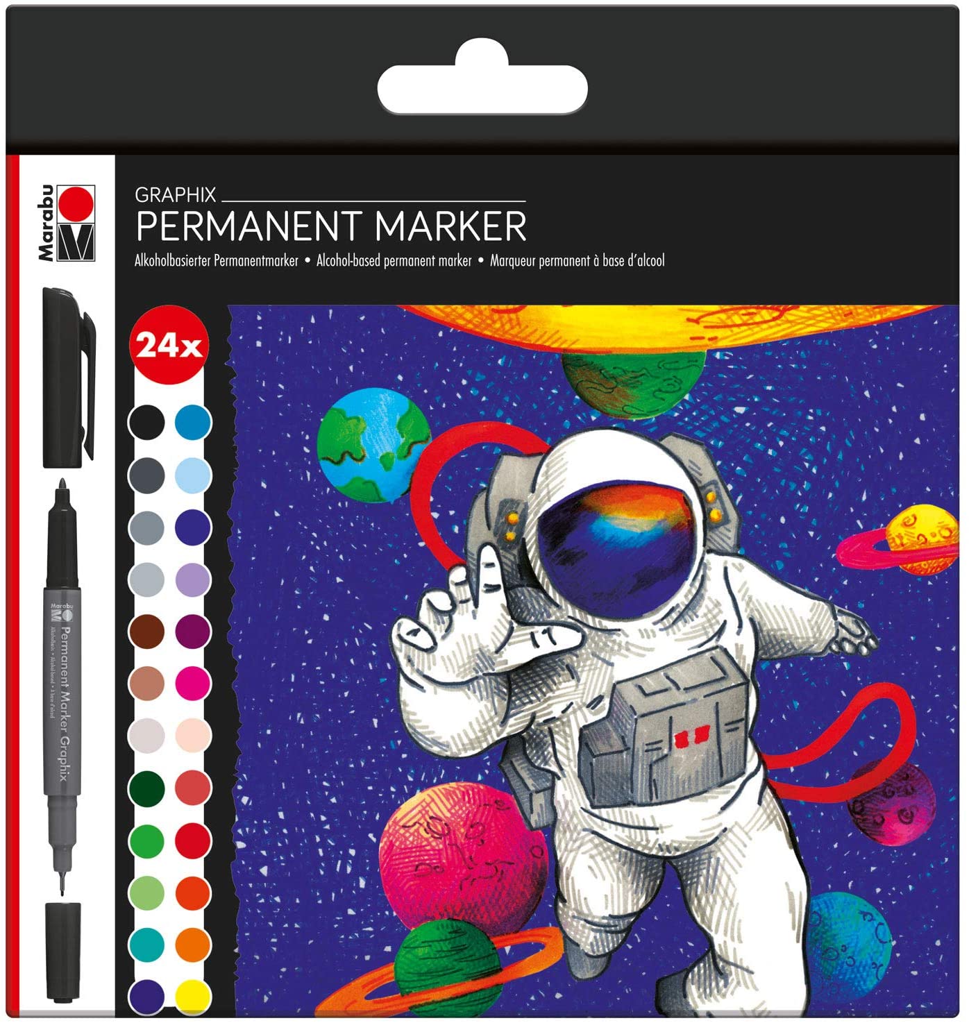 Markere permanente cu vârf dublu: vârf din fibră de poliester, 1-2 mm și vârf extrem de fin din plastic acoperit cu metal, 0.5 mm.