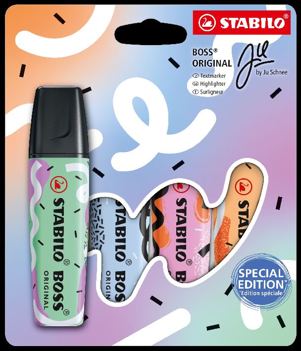 Descoperiți iluminatorul Stabilo BOSS ORIGINAL de la Ju Schnee, o carcasă colorată cu 4 pixuri care impresionează atât prin design, cât și prin funcționalitate. Designul artistic al lui Ju Schnee oferă fiecărui marker o notă unică și îl face însoțitorul perfect pentru proiecte creative, cum ar fi umbrirea, încadrarea sau literele de mână.