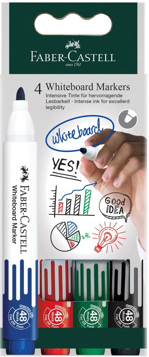 Markere pentru tablă albă Faber-Castell cu vârf rotund.