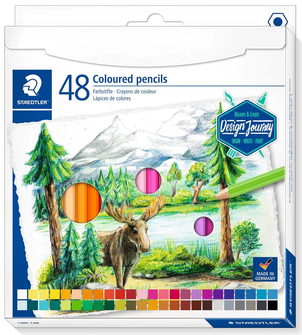 Set 48 creioane colorate în cutie din carton, fabricate din lemn de origine certificată PEFC, din păduri sustenabile. Formă hexagonală, grafit moale, culori vii.