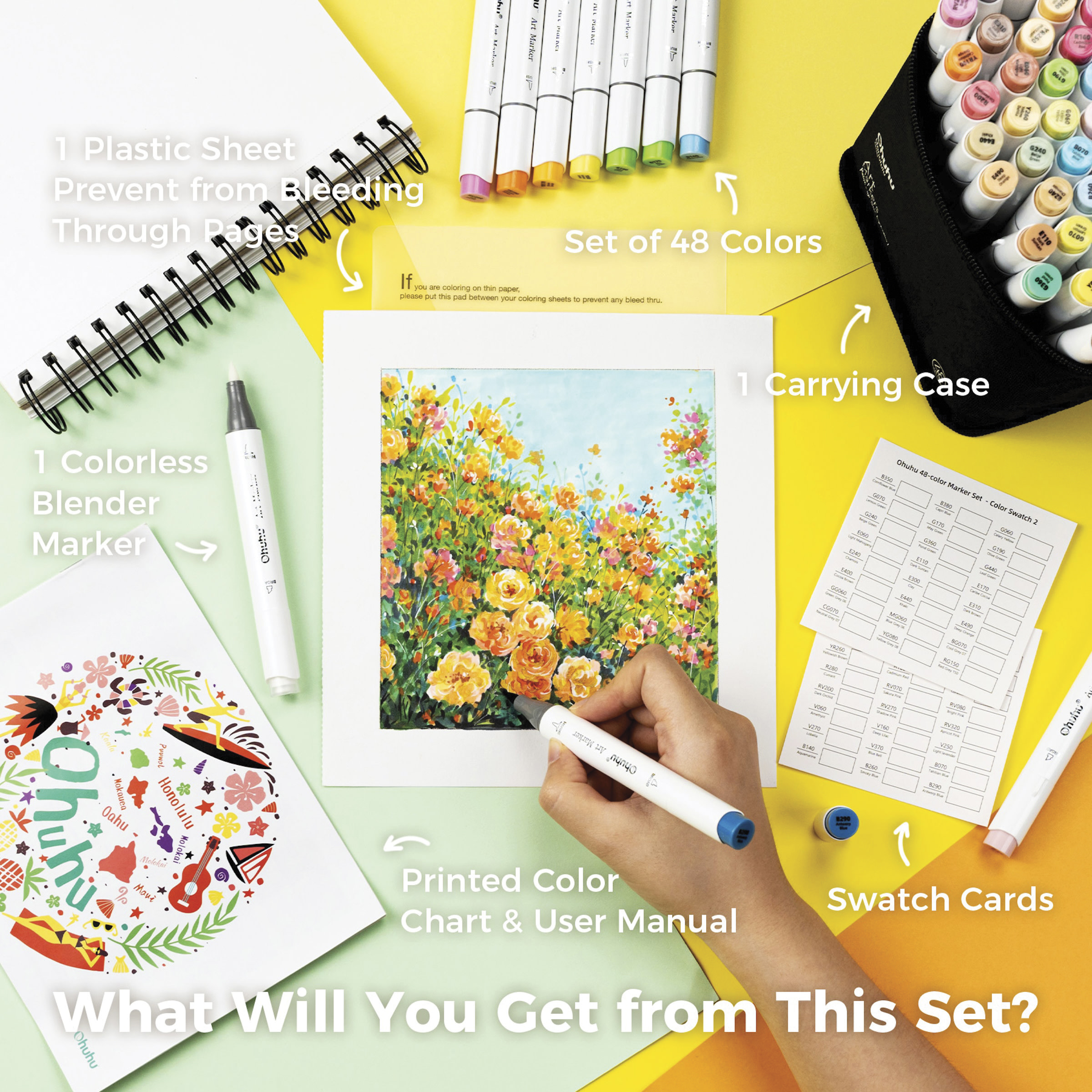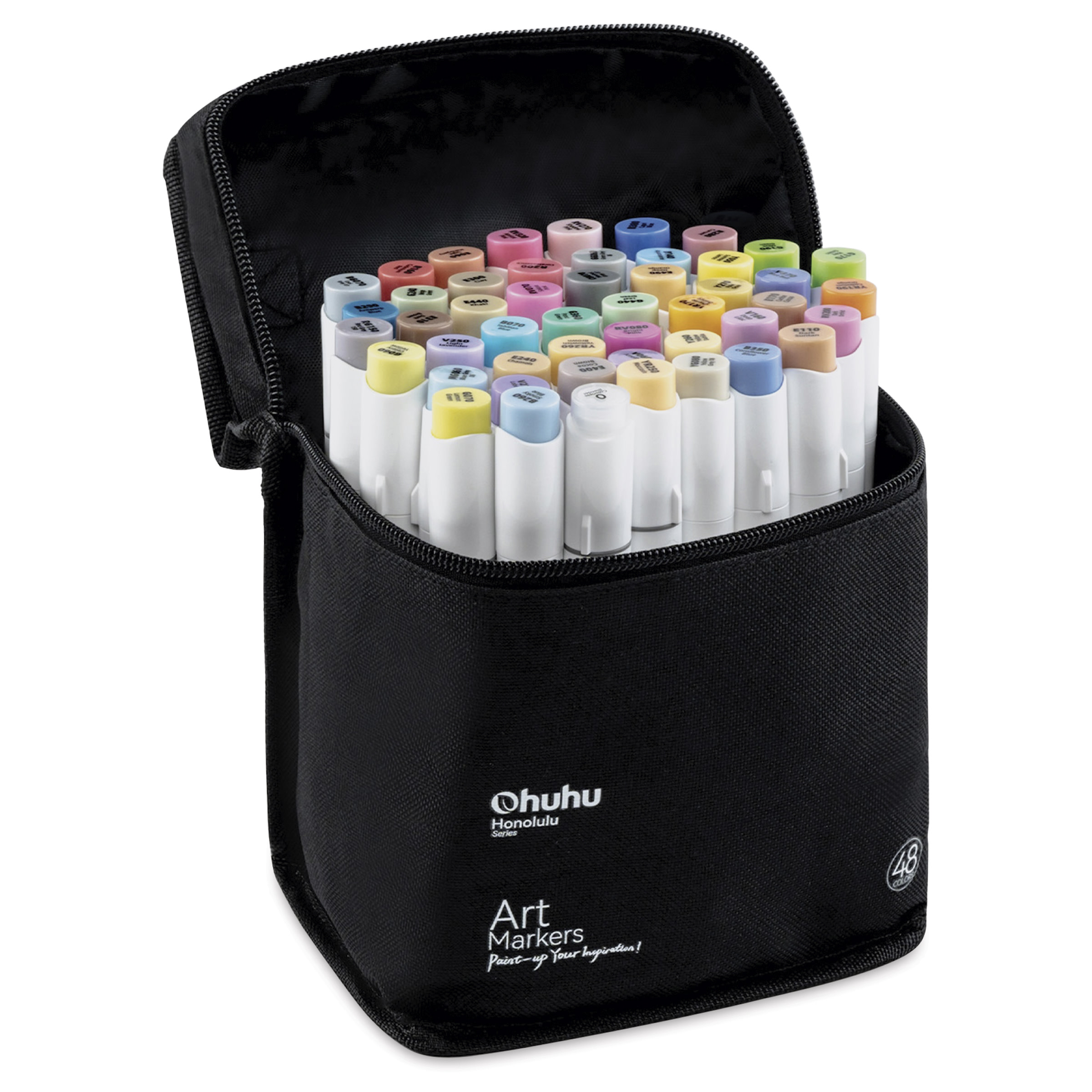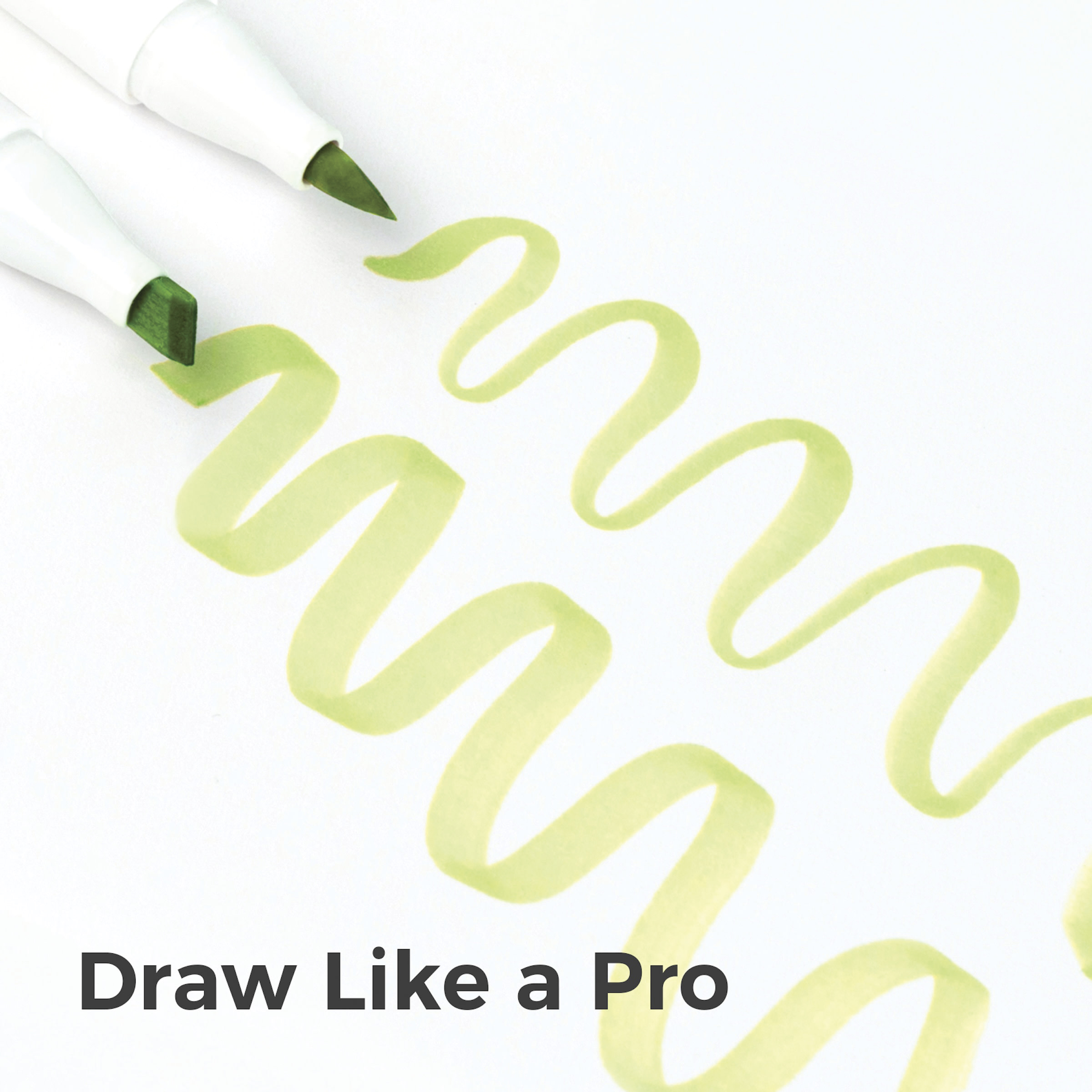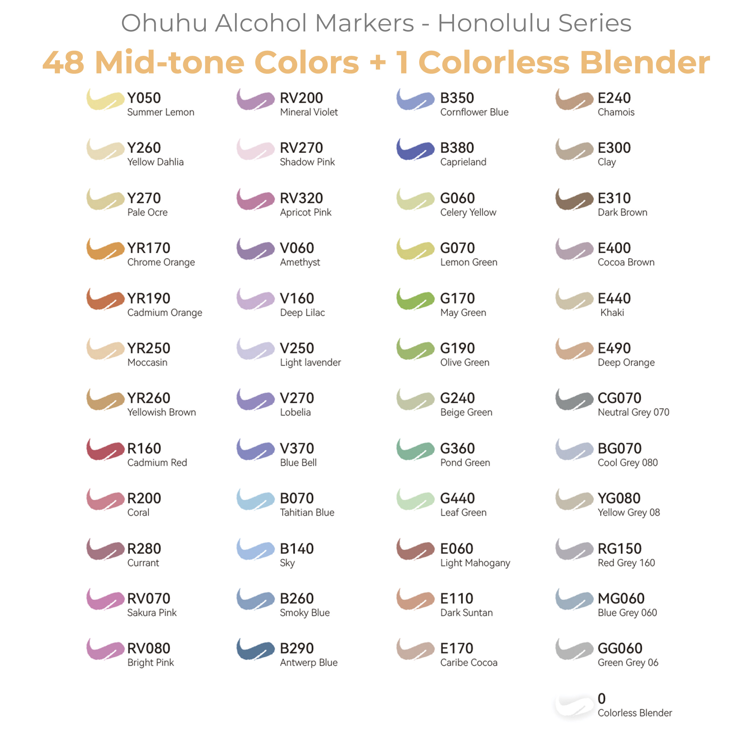 Setul vine într-o cutie frumoasă și include 49 de markere (48 de culori cu tonuri medii și 1 blender incolor) cu vârf dublu pe bază de alcool de tip Brush & Chisel.