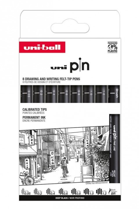Set de 7 linere și 1 marker tip pensulă cu cerneală pigment pe bază de apă tip Super Ink (patent Uni-Ball) rezistentă la decolorare și apă.