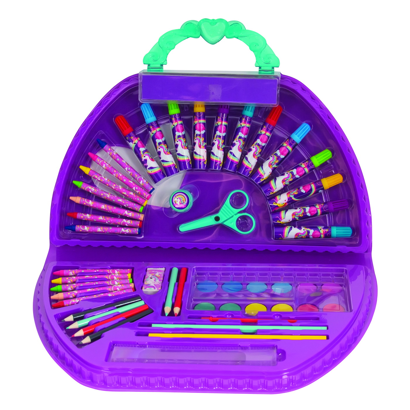 Setul de desen ART CASE ajuta copiii sa ia setul de colorat peste tot, pentru a putea desena, colora si picta oriunde ar fi. Acesta include 12 creioane cerate, 12 acuarele, 12 marcatori, 6 creioane colorate, 1 perie, 1 rigla, 2 creioane, 1 radiera, 1 ascutitoare, 1 pereche de foarfece cu design Unicorn!
