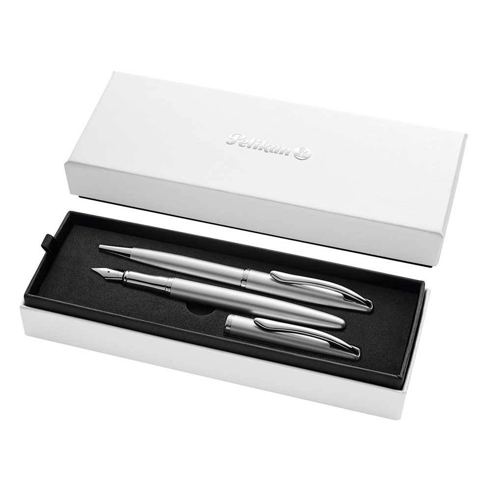 Setul conține un stilou și un pix din gama Jazz Noble Elegance, culoare argintie, într-o cutie deosebită pentru cadou.