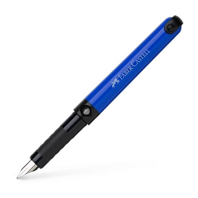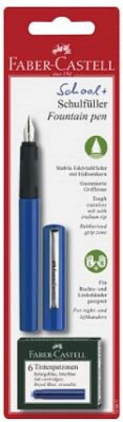 Stilou scolar marca Faber Castell plus 6 cartuse, model Albastru. Stiloul potrivit atat pentru dreptaci, cat si pentru stangaci. Este prevazut cu fereastra pentru vizualizarea nivelului de cerneala. Pentru incarcare se folosesc cartuse cerneala standard. Clema de prindere este din metal. Capac si corp cu liniatura material anti-alunecare pentru a preveni caderea de pe birou. Ambalajul include stilou si 6 rezerve de cerneala albastra.