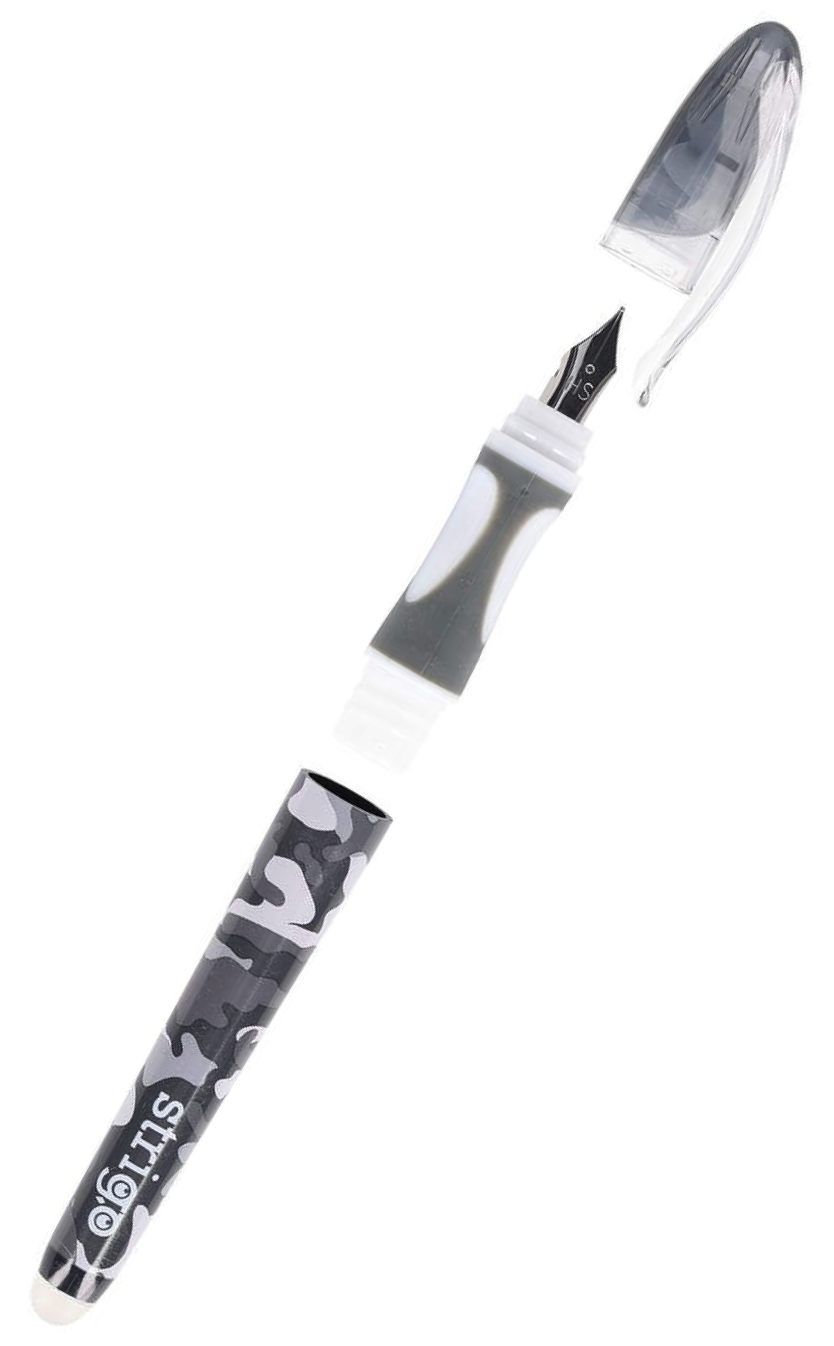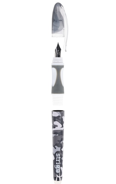 Stiloul Strigo cu cerneală care se șterge, cele două rezerve și radiera (dispozitiv de ștergere cerneală) formează setul complet de scriere și ștergere de care ai nevoie.