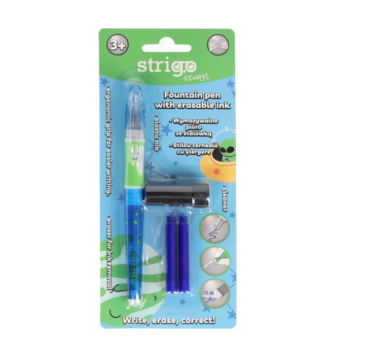 Stiloul Strigo cu cerneală care se șterge, cele două rezerve și radiera (dispozitiv de ștergere cerneală) formează setul complet de scriere și ștergere de care ai nevoie.