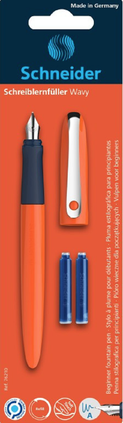 Stiloul Schneider Wavy, creat pentru elevi, este disponibil în patru culori strălucitoare - albastru, verde, roz și portocaliu – și este echipat cu peniță din oțel inoxidabil, rezistentă, și cu vârf din iridiu – perfect pentru elevii care încep să scrie cu stiloul.