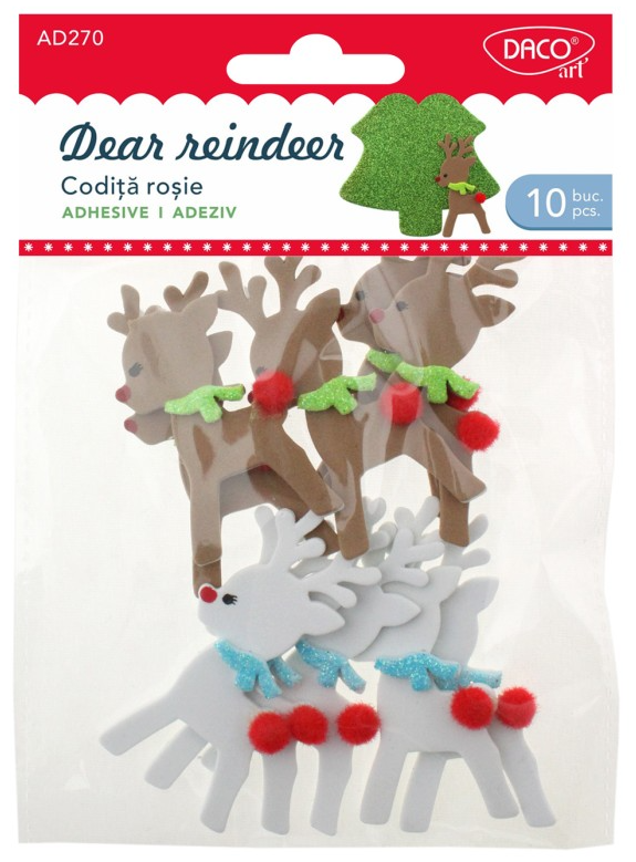 - Setul conține 10 bucăți cu model ren din spumă 3D autoadezivă tip pom-pom