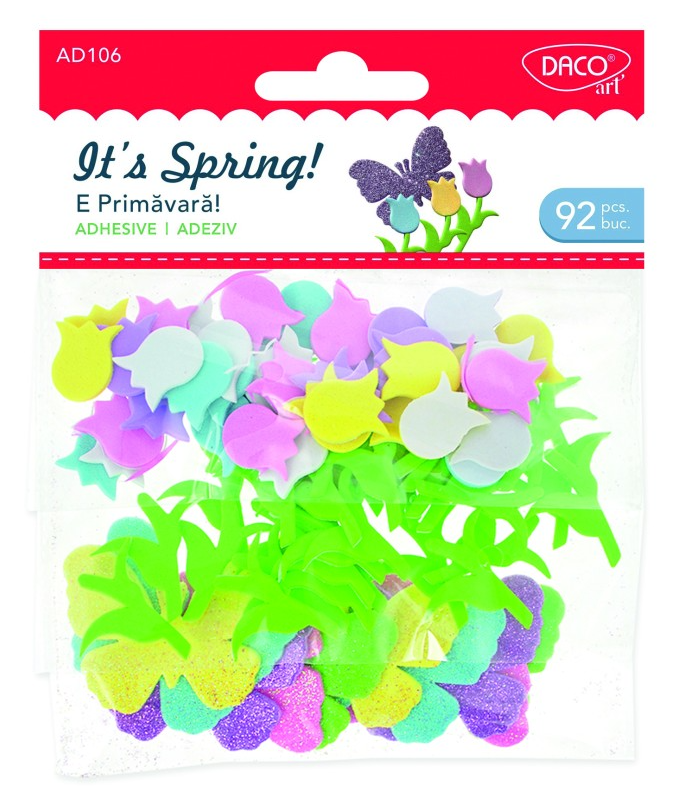 Setul conține 92 bucăți de forme din spumă autoadezivă: lalele, frunze, fluturi