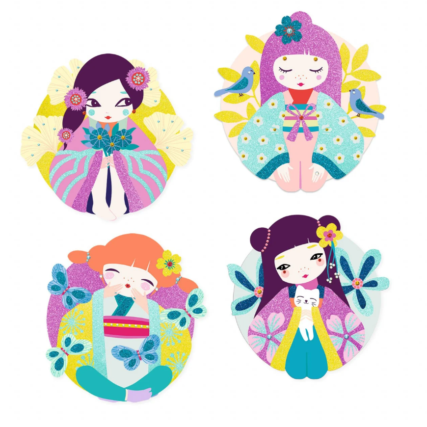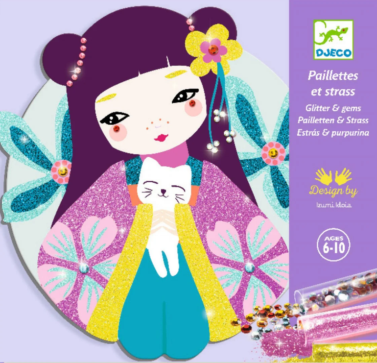 4 tablouri în forma de medalioane de decorat și iluminat cu paiete si strasuri mici. Copiii plasează imaginea în cutie, expun zonele pre-lipite, apoi așază strasurile și presără sclipici urmând instrucțiunile codificate pe culori. Pentru a-și etala creațiile, copiii atașează micile cârlige de agățat prevăzute în acest scop pe spatele imaginilor. Apoi poți admira păpușile strălucitoare!