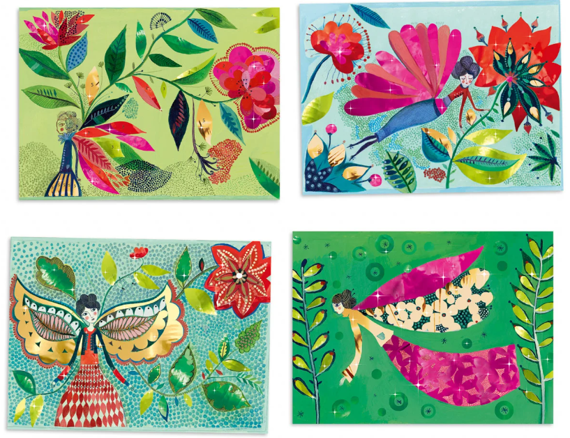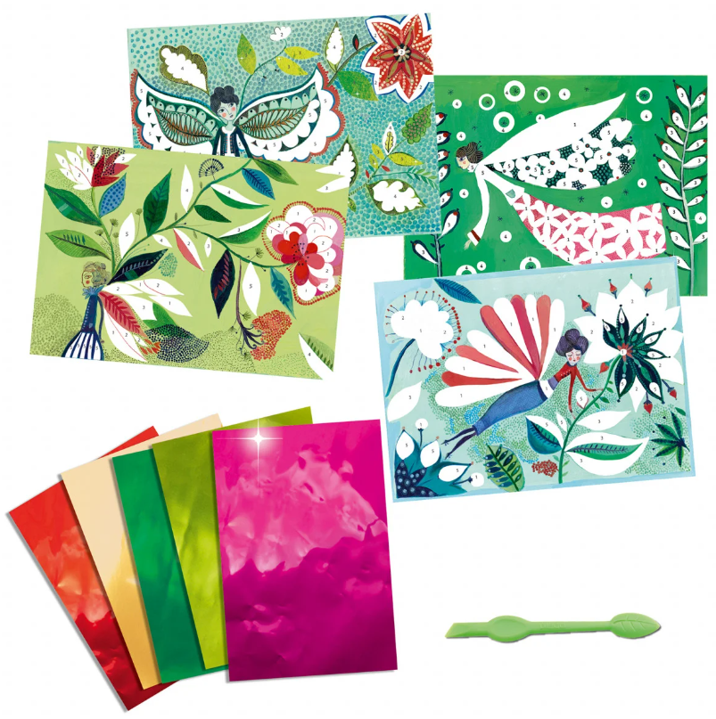 Conține: 4 planșe, 15 coli staniol colorate, instrument de lucru și o cărticică cu instrucțiuni.